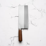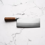 The cleaver, distinct from its Western counterpart, is a specialized tool designed for precision meat cutting. It features a robust, wide blade adept at slicing through large cuts of meat and bones with ease and efficiency.