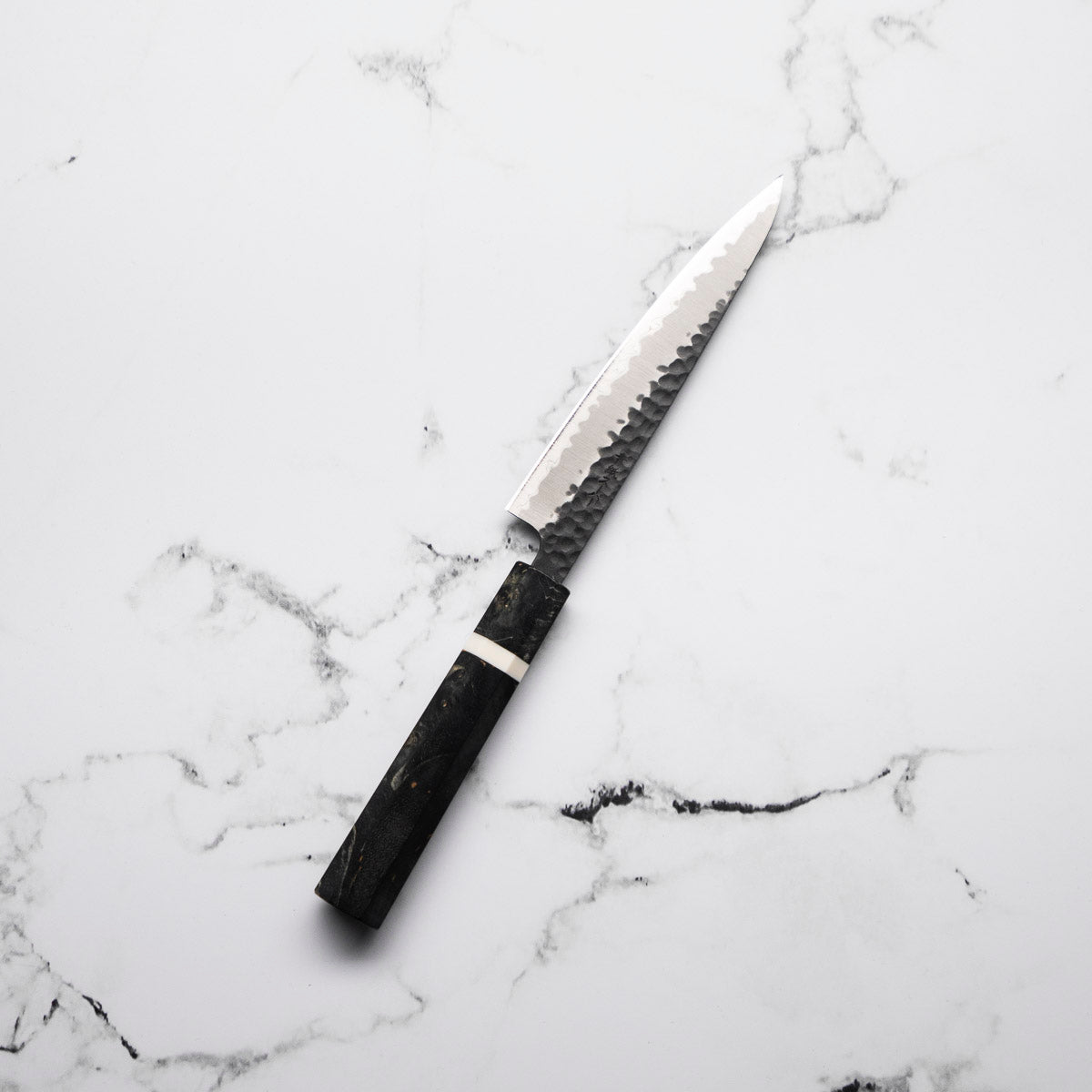 | Blade Material: | Shirogami Carbon Steel core + Soft Iron Kurouchi Clad |