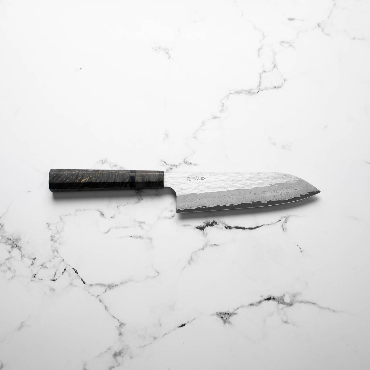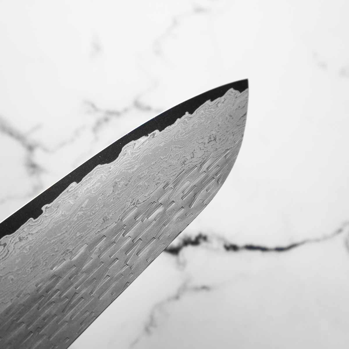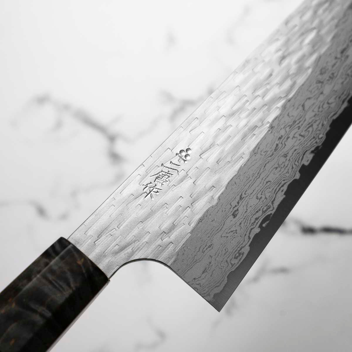 Nigara Hamono are truly some of the most experienced knifemakers in Japan. Now on their 8th generation of blacksmiths, they are masters at stainless damascus forging and heat treatment. The Anmon Damascus we have available have a matte finish and are polished underneath, resulting in a brilliant visual contrast.
