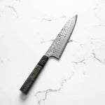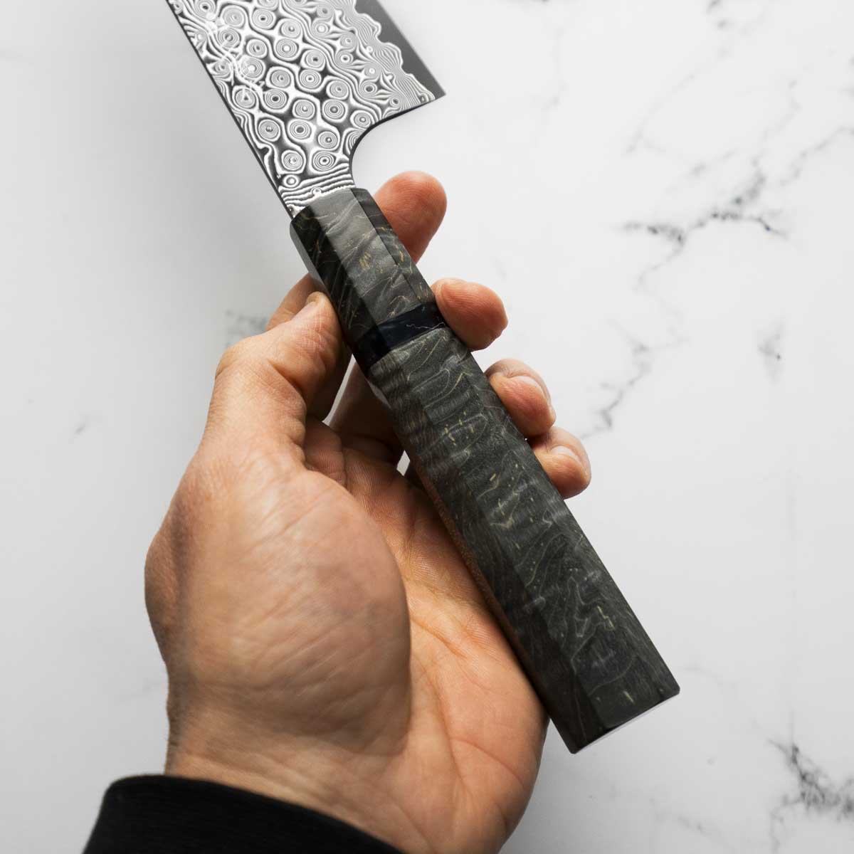 Nigara Hamono are truly some of the most experienced knifemakers in Japan. Now on their 8th generation of blacksmiths, they are masters at stainless damascus forging and heat treatment. The Anmon Damascus we have available have a matte finish and are polished underneath, resulting in a brilliant visual contrast.