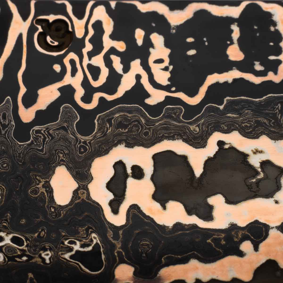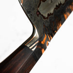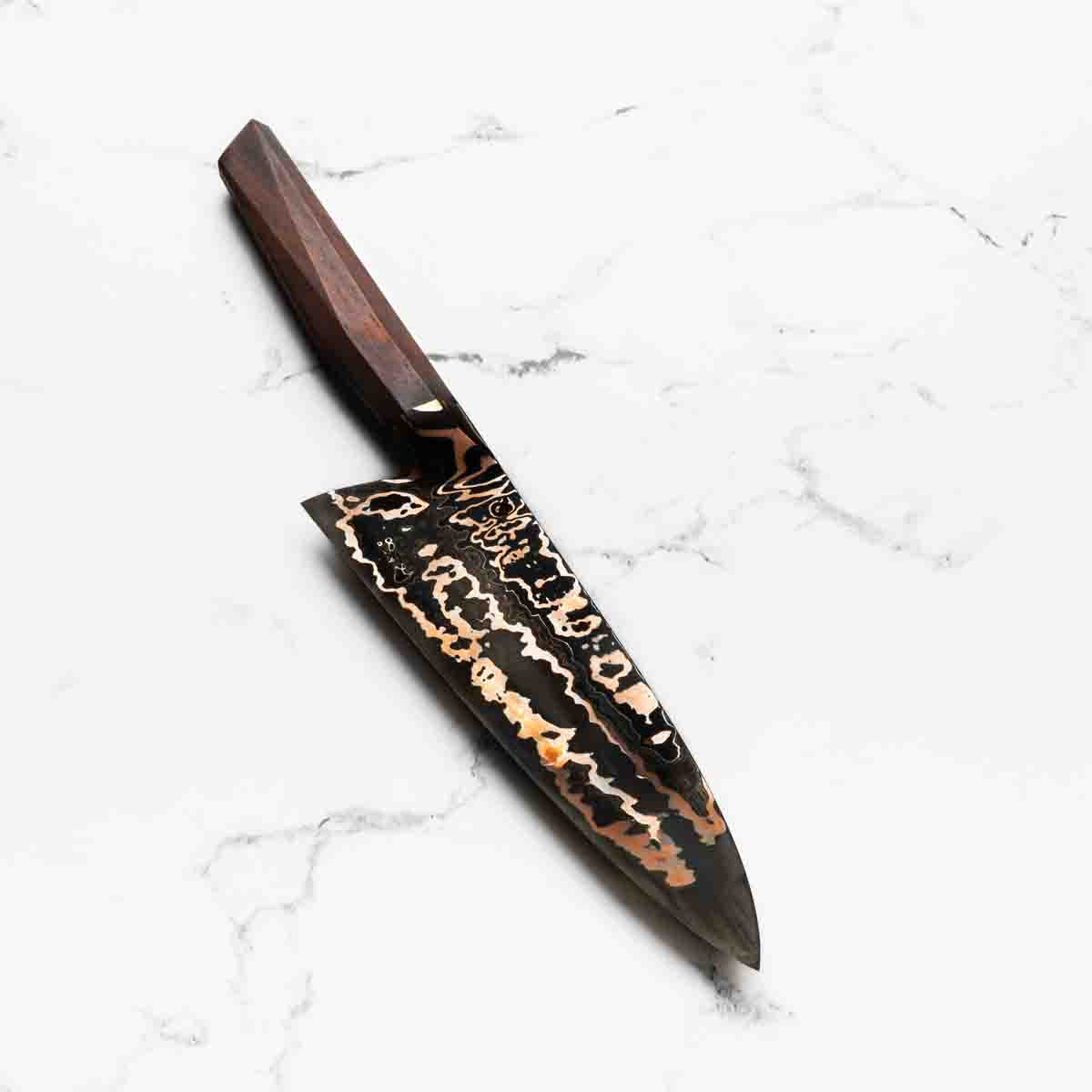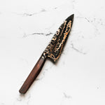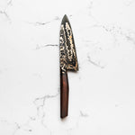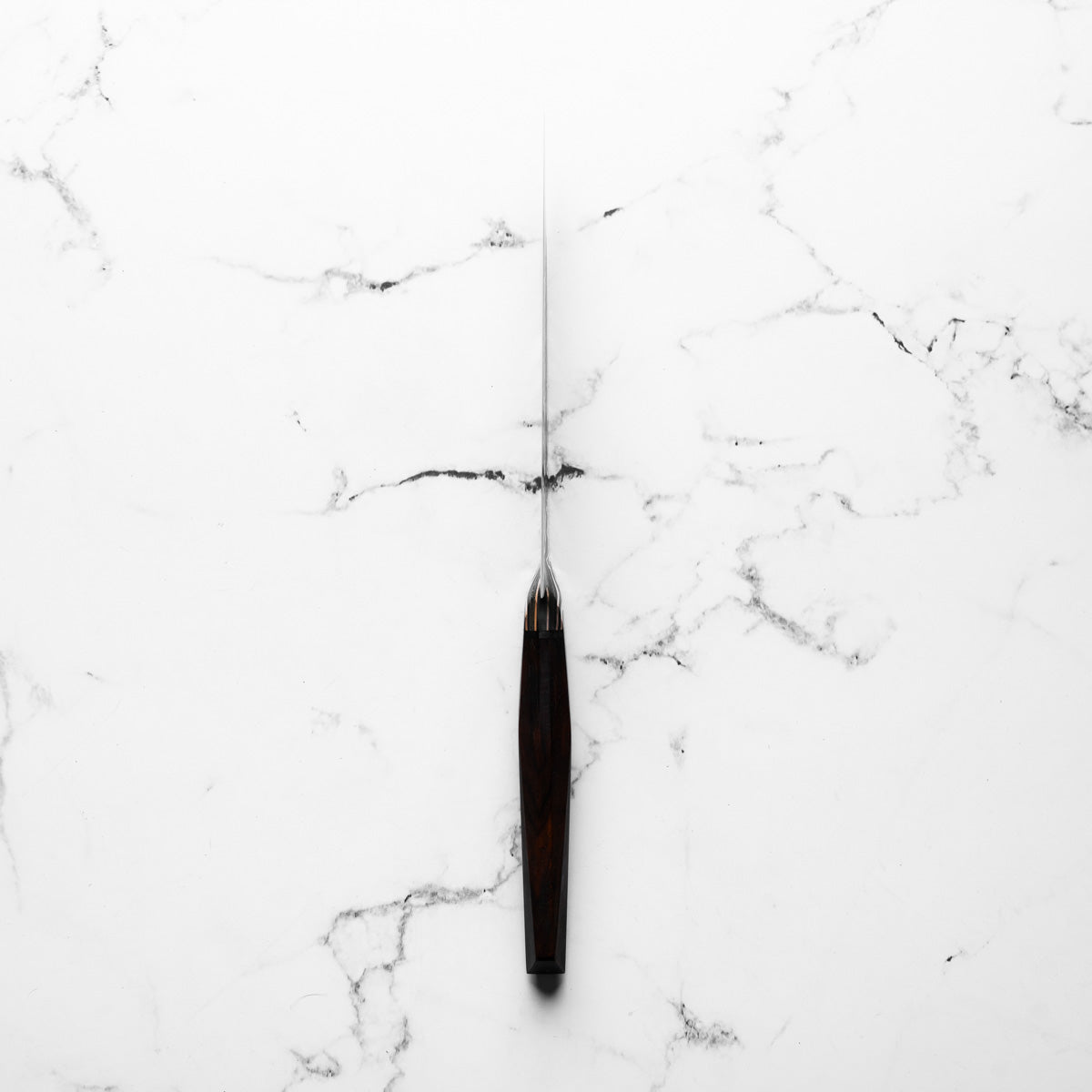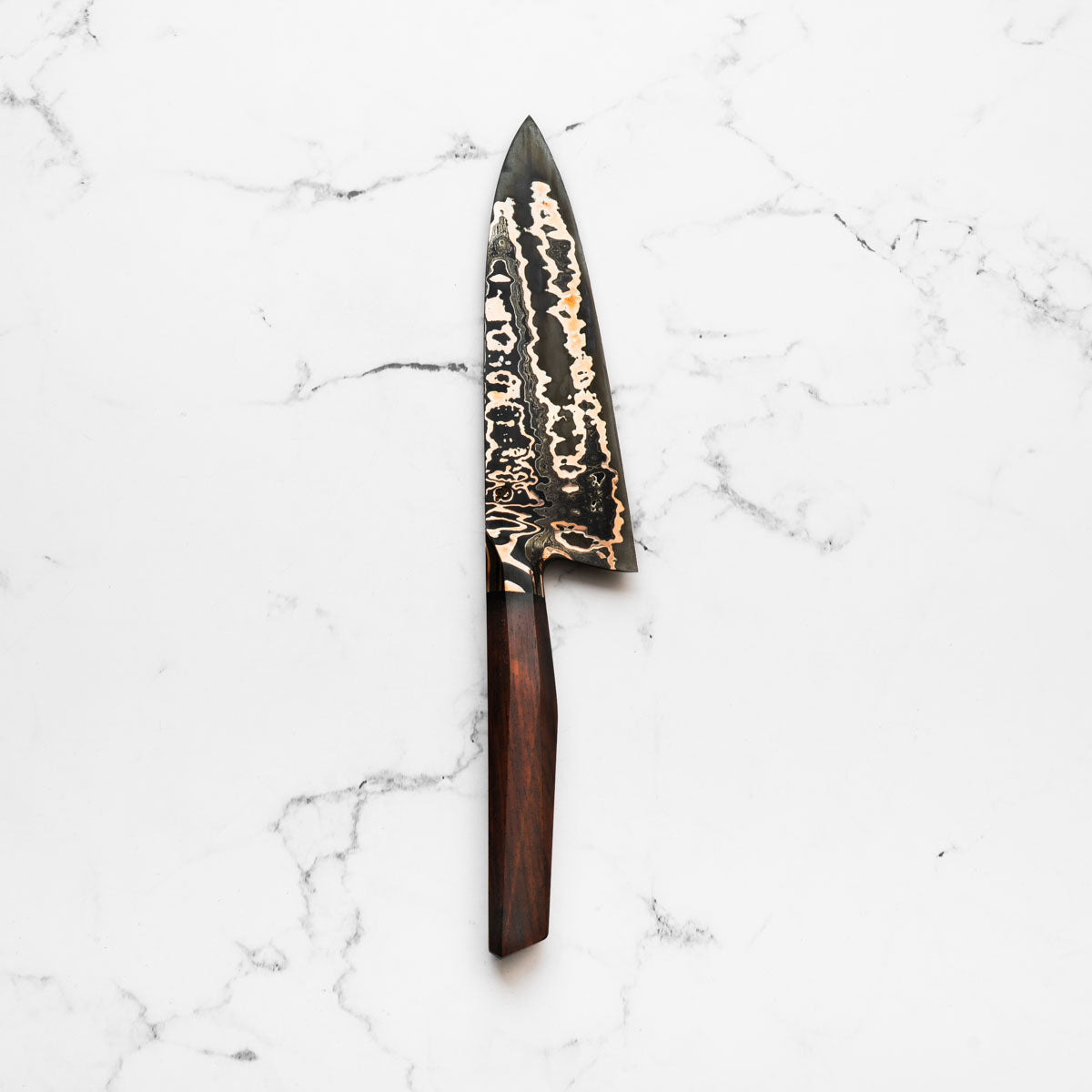 This knife is made from a high-carbon steel and as such, will require a little more care than a regular off-the-shelf knife. It must be dried shortly after use, as prolonged exposure to moisture can cause rust spots to appear. A very light coat of oil during storage also helps to prevent rust spots. A patina (colouration and seasoning of the steel) will occur with use.