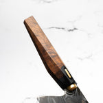 This knife is made from a high-carbon steel and as such, will require a little more care than a regular off-the-shelf knife. It must be dried shortly after use, as prolonged exposure to moisture can cause rust spots to appear. A very light coat of oil during storage also helps to prevent rust spots. A patina (colouration and seasoning of the steel) will occur with use.
