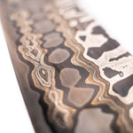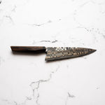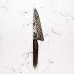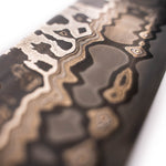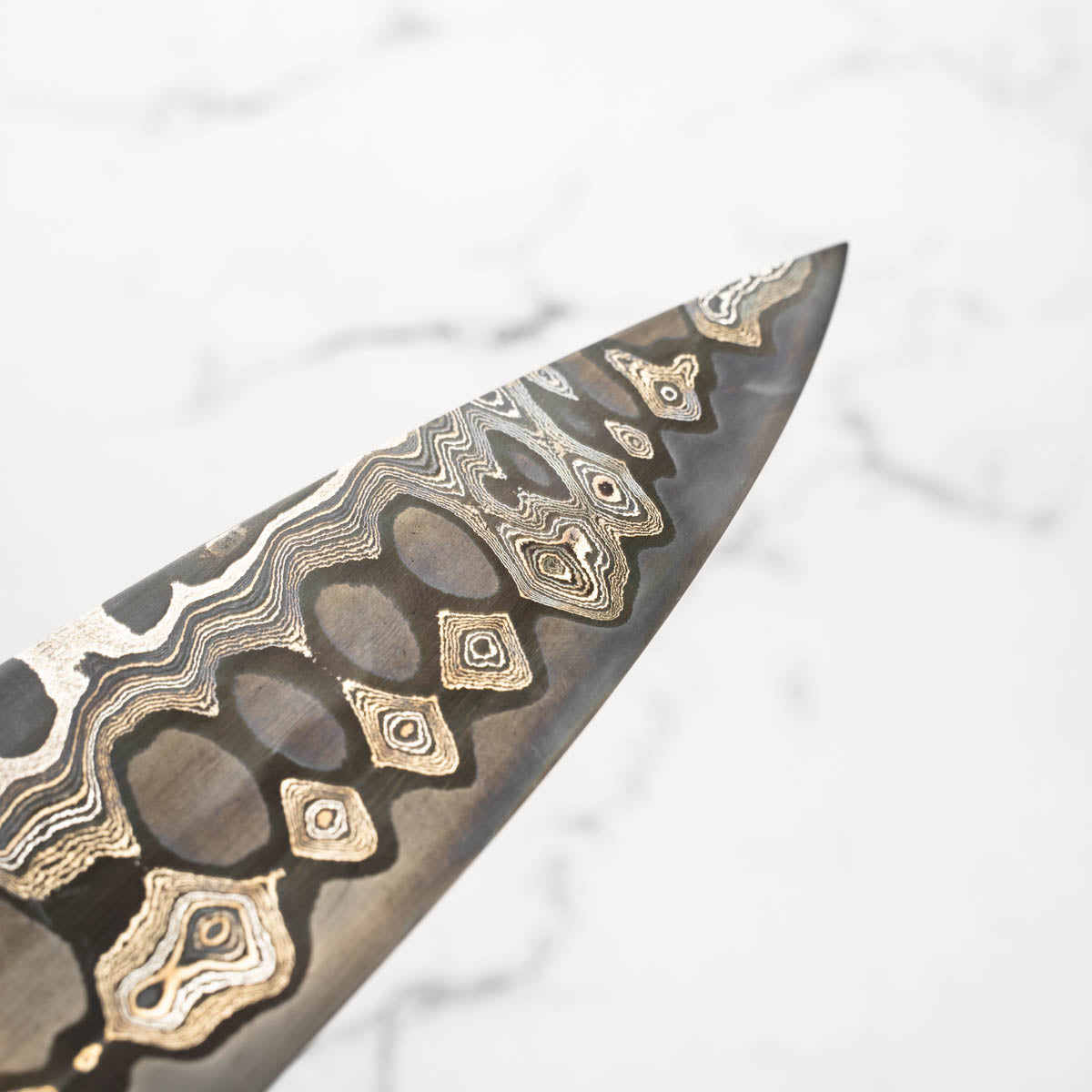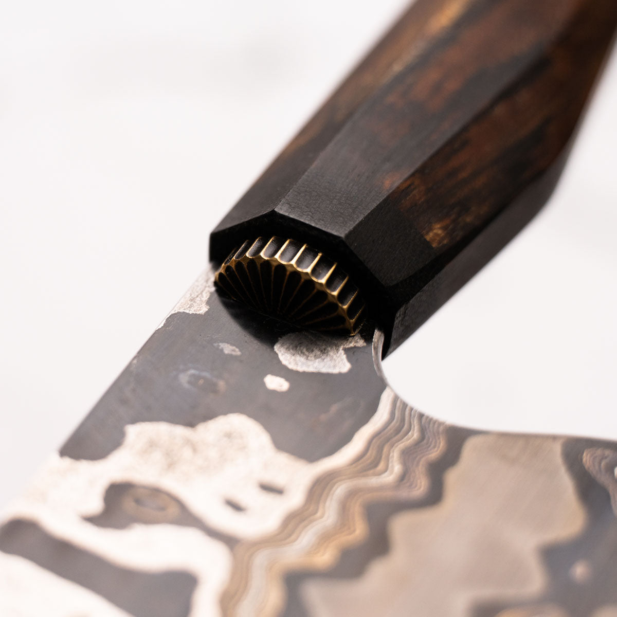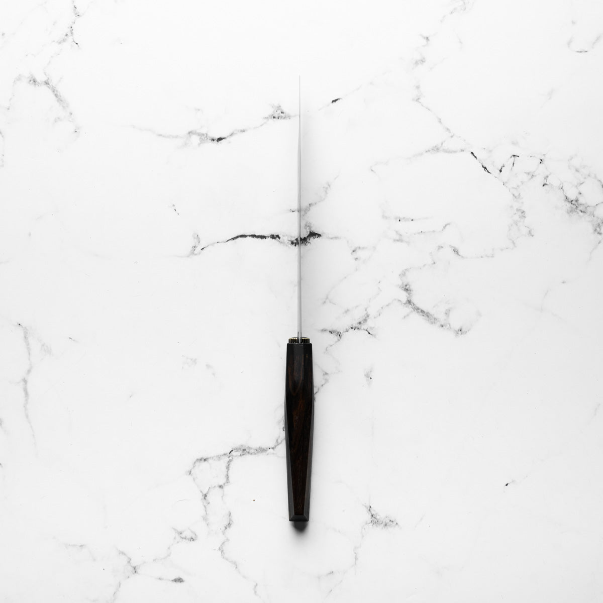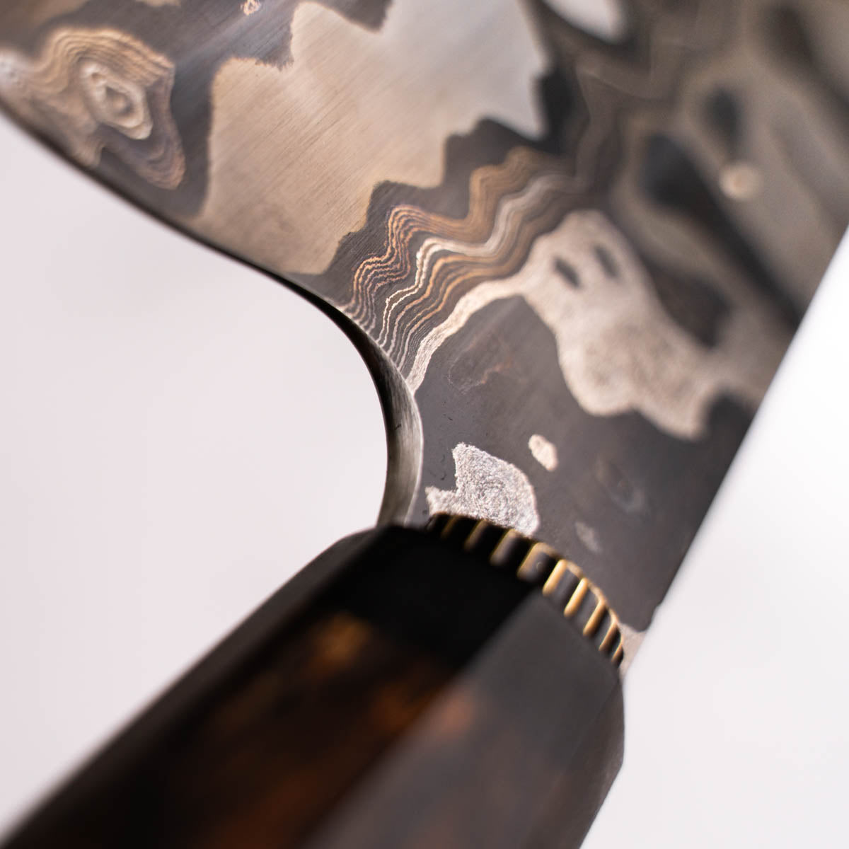 This knife is made from a high-carbon steel and as such, will require a little more care than a regular off-the-shelf knife. It must be dried shortly after use, as prolonged exposure to moisture can cause rust spots to appear. A very light coat of oil during storage also helps to prevent rust spots. A patina (colouration and seasoning of the steel) will occur with use.