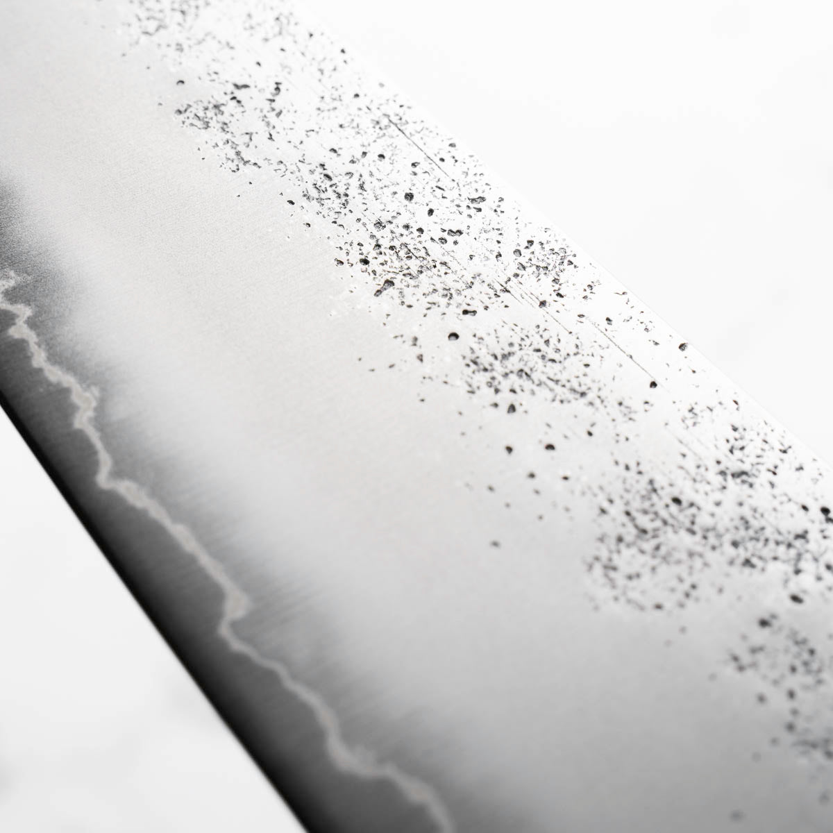 Japanese Ginsan steel, also known as Silver-3 or G3, is an underrated high-grade semi-stainless steel loved by many for being in the ‘goldilocks zone’ of knife steels. It holds a very respectable edge, but is effortless to sharpen. It is considered the semi-stainless version of White 2. It is the knife steel of choice for many home cooks and professional chefs alike.