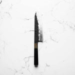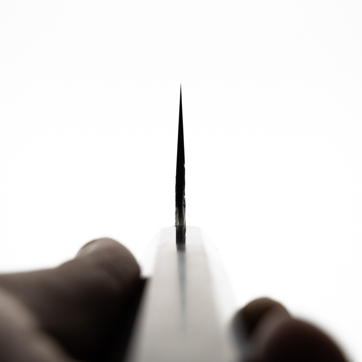 Embracing a rapid rise in popularity for his unique designs and committment to striving for perfection, Shunsuke Manaka is the man behind Kisuke knives. From the sketchbook to the kitchen, he is the sole craftsman behind the entire knifemaking process. Shunsuke engineers these knives using a process known as Warikomi, whereby a glowing hot piece of steel is split, and the core steel is wedged in and forged together. The split steel becomes the outer layers, and the core steel is exposed at the edge. This process produces a stronger, tougher more durable blade.