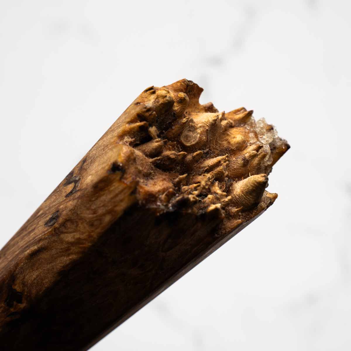 This knife is made from a high-carbon steel and as such, will require a little more care than a regular off-the-shelf knife. It must be dried shortly after use, as prolonged exposure to moisture can cause rust spots to appear. A very light coat of oil during storage also helps to prevent rust spots. A patina (colouration and seasoning of the steel) will occur with use.