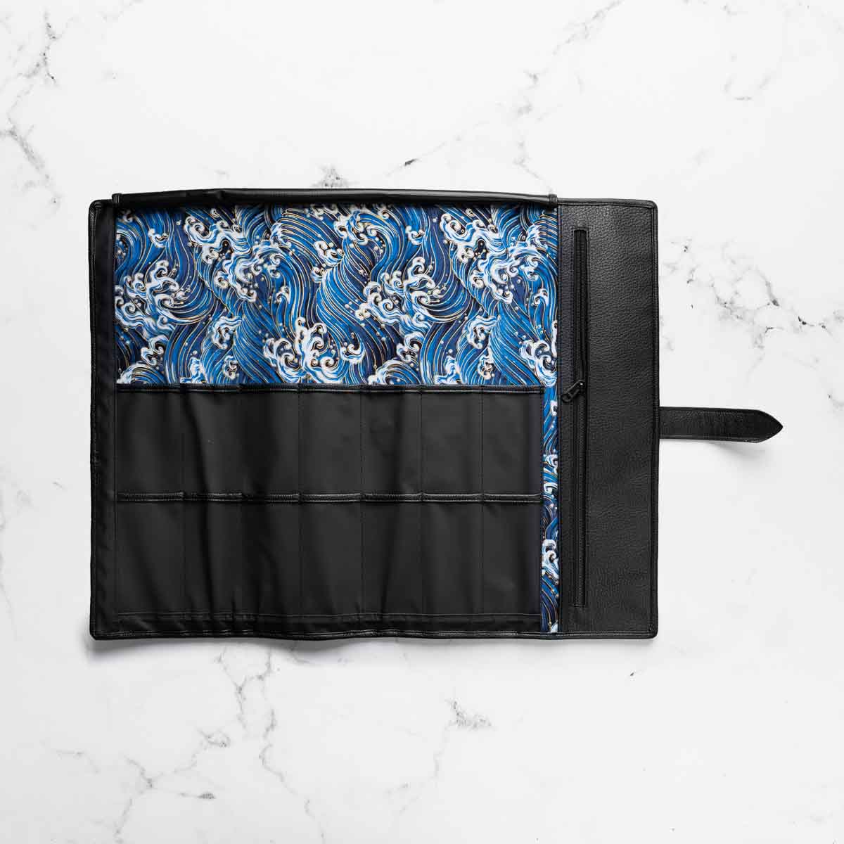 Elevate your culinary travels with the assured protection of the 7 Pocket 1000D PVC Knife Roll. This fundamental knife roll is meticulously crafted for both accomplished chefs and emerging culinary talents, showcasing a streamlined roll-up design paired with five dedicated knife pockets. This version is lined with a beautiful blue and gold Hokusai inspired wave pattern.