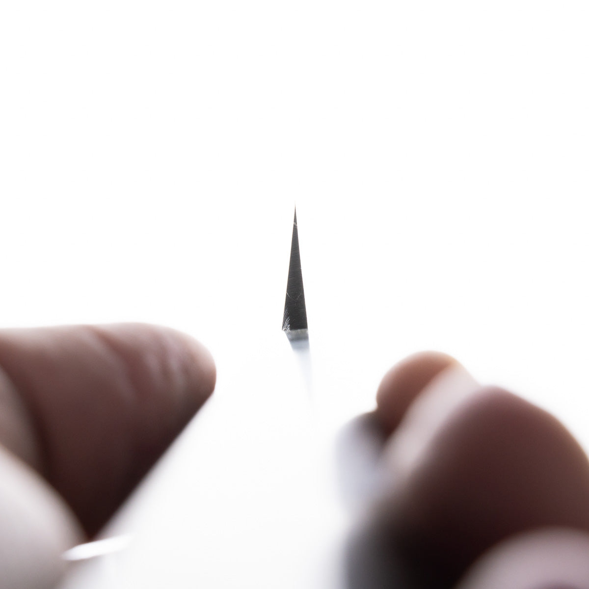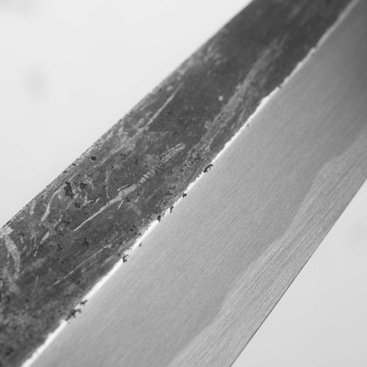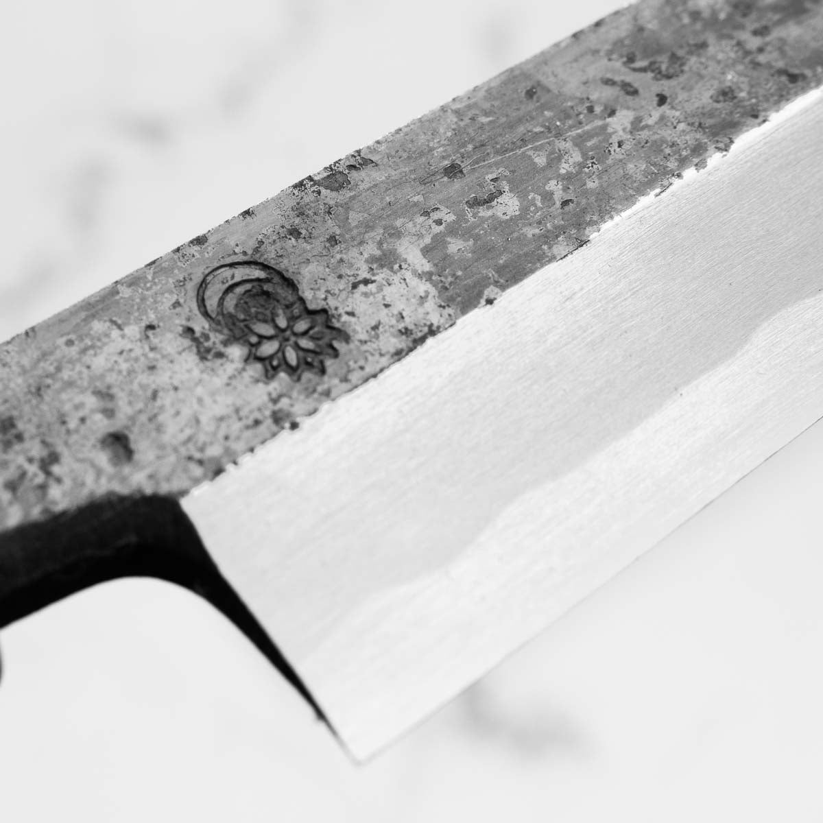 Japanese White Steel #2, a traditional high-carbon steel, is cherished for its purity and fine grain structure, enabling razor-sharp edges, at the cost of being reactive. It is one of the easiest steels to sharpen, but cannot be left wet for even short periods otherwise rust spots can occur. If you’re fastidious in your knife maintenance, this knife can steel can be extremely rewarding to use.