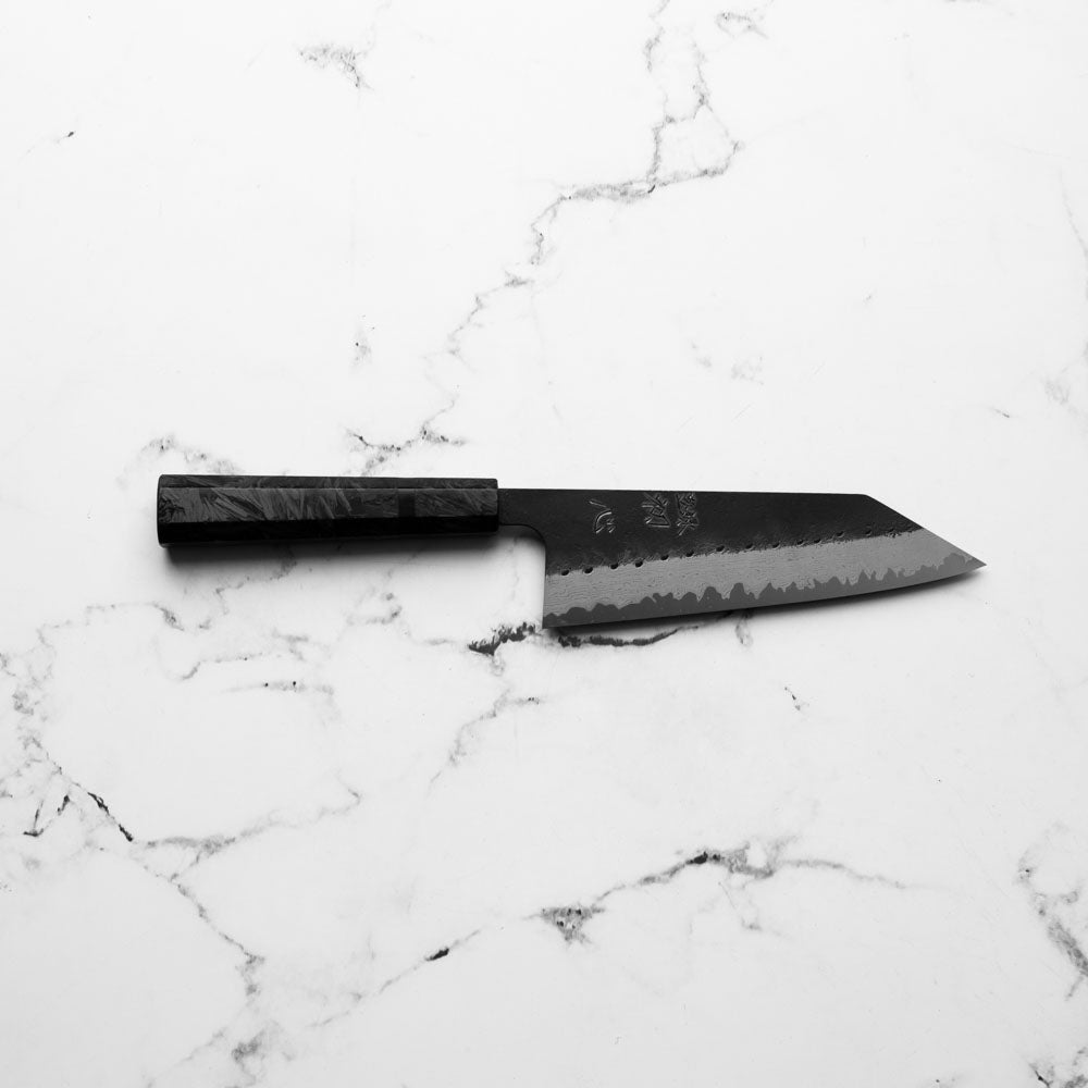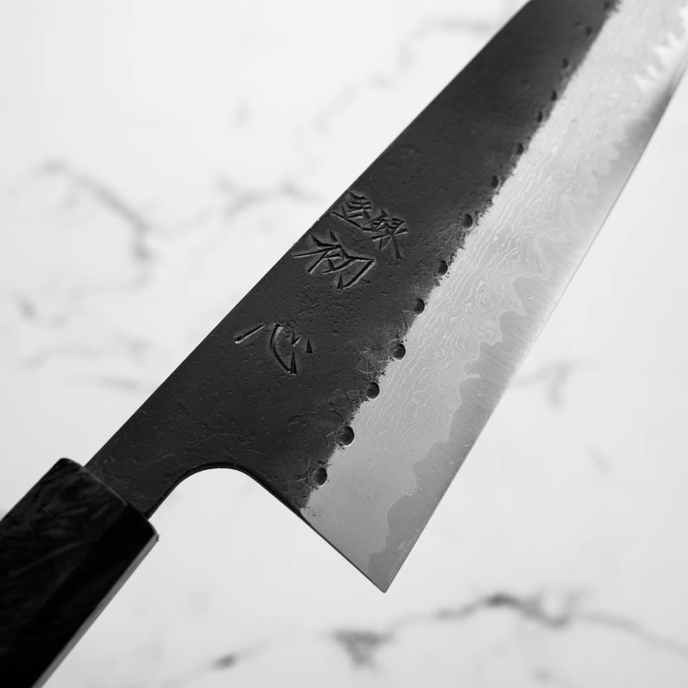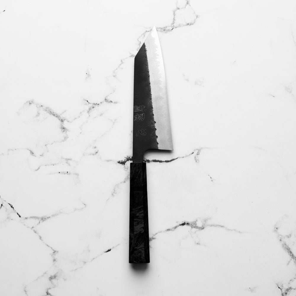Hatsukokoro Shinkiro Blue Super Damascus Kurouchi Bunka 165mm - Dark Carbon Fibre