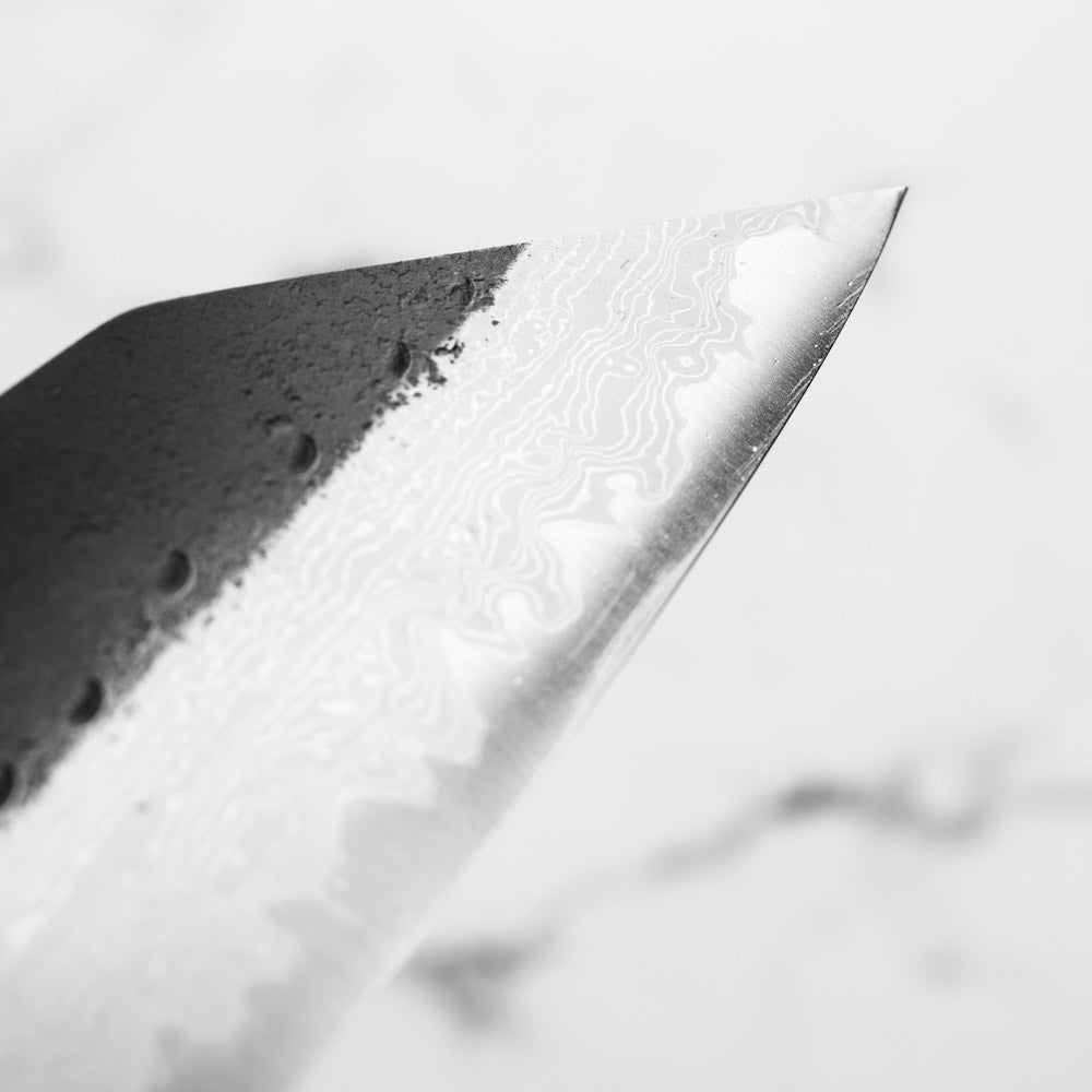 This knife is made from a high-carbon steel and as such, will require a little more care than a regular off-the-shelf knife. It must be dried shortly after use, as prolonged exposure to moisture can cause rust spots to appear. A very light coat of oil during storage also helps to prevent rust spots. A patina (colouration and seasoning of the steel) will occur with use.