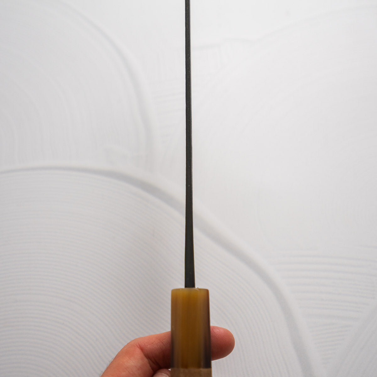 This knife is made from a high-carbon steel and as such, will require a little more care than a regular off-the-shelf knife. It must be dried shortly after use, as prolonged exposure to moisture can cause rust spots to appear. A very light coat of oil during storage also helps to prevent rust spots. A patina (colouration and seasoning of the steel) will occur with use.