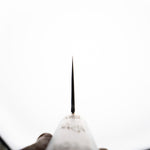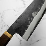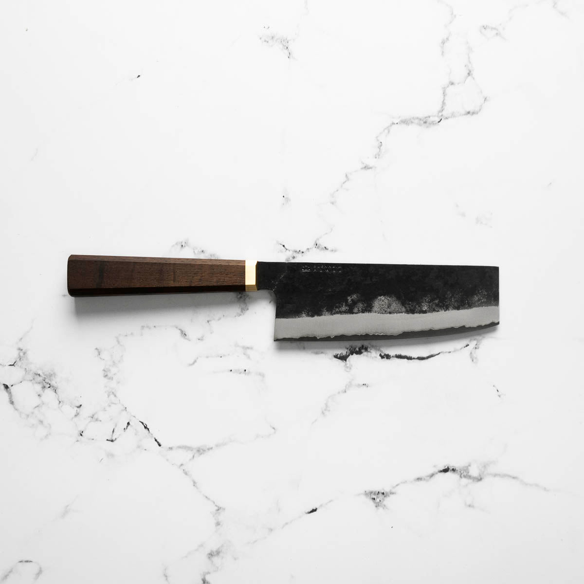 This knife is made from a high-carbon steel and as such, will require a little more care than a regular off-the-shelf knife. It must be dried shortly after use, as prolonged exposure to moisture can cause rust spots to appear. A very light coat of oil during storage also helps to prevent rust spots. A patina (colouration and seasoning of the steel) will occur with use.