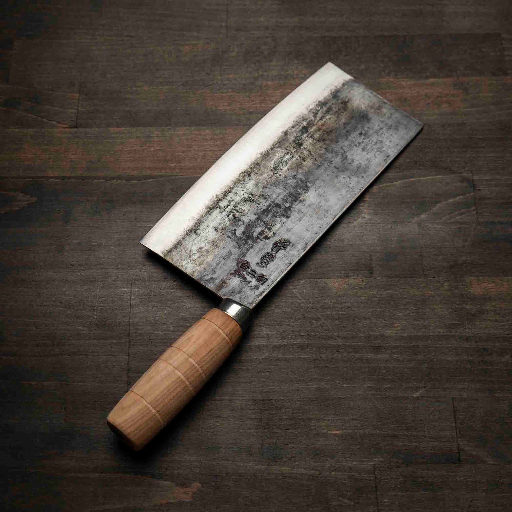 This knife is made from a high-carbon steel and as such, will require a little more care than a regular off-the-shelf knife. It must be dried shortly after use, as prolonged exposure to moisture can cause rust spots to appear. A very light coat of oil during storage also helps to prevent rust spots. A patina (colouration and seasoning of the steel) will occur with use.