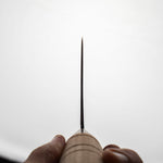 Japanese White Steel #2, a traditional high-carbon steel, is cherished for its purity and fine grain structure, enabling razor-sharp edges, at the cost of being reactive. It is one of the easiest steels to sharpen but cannot be left wet for even short periods otherwise rust spots can occur. If you’re fastidious in your knife maintenance, this knife steel can be extremely rewarding to use.