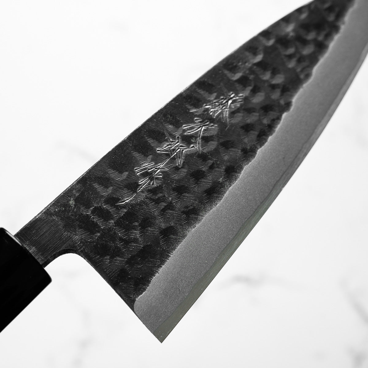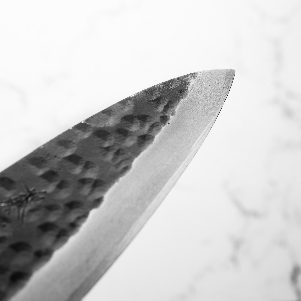 Japanese White Steel #2, a traditional high-carbon steel, is cherished for its purity and fine grain structure, enabling razor-sharp edges, at the cost of being reactive. It is one of the easiest steels to sharpen, but cannot be left wet for even short periods otherwise rust spots can occur. If you’re fastidious in your knife maintenance, this knife steel can be extremely rewarding to use.