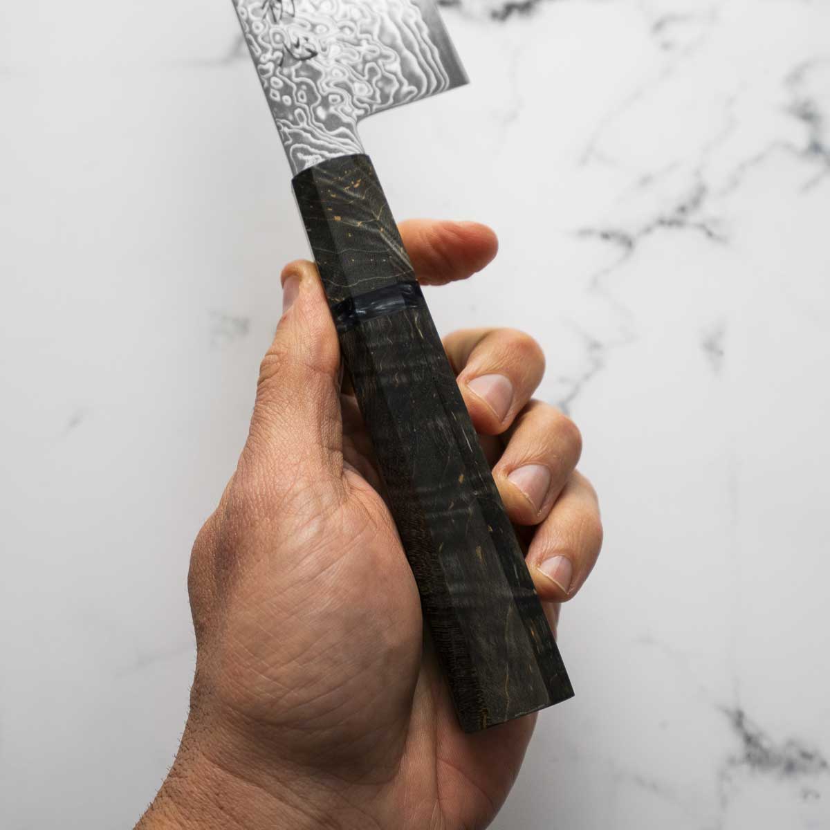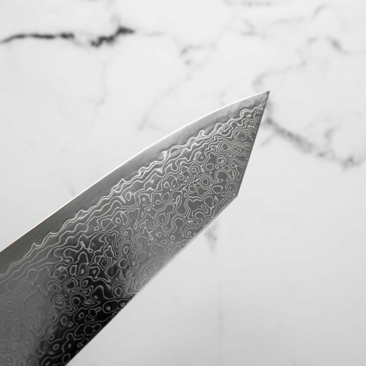 Japanese SG2, also known as R2 steel, is a high-end, powdered metallurgy stainless steel and one of the finest knife-making steels available in Japan. It is a favourite of many for its exceptional hardness and edge retention. Its fine, uniform grain structure enables razor-sharp edges, all the while holding an edge for much longer than Carbon steel knives, without needing to be concerned about rust appearing.