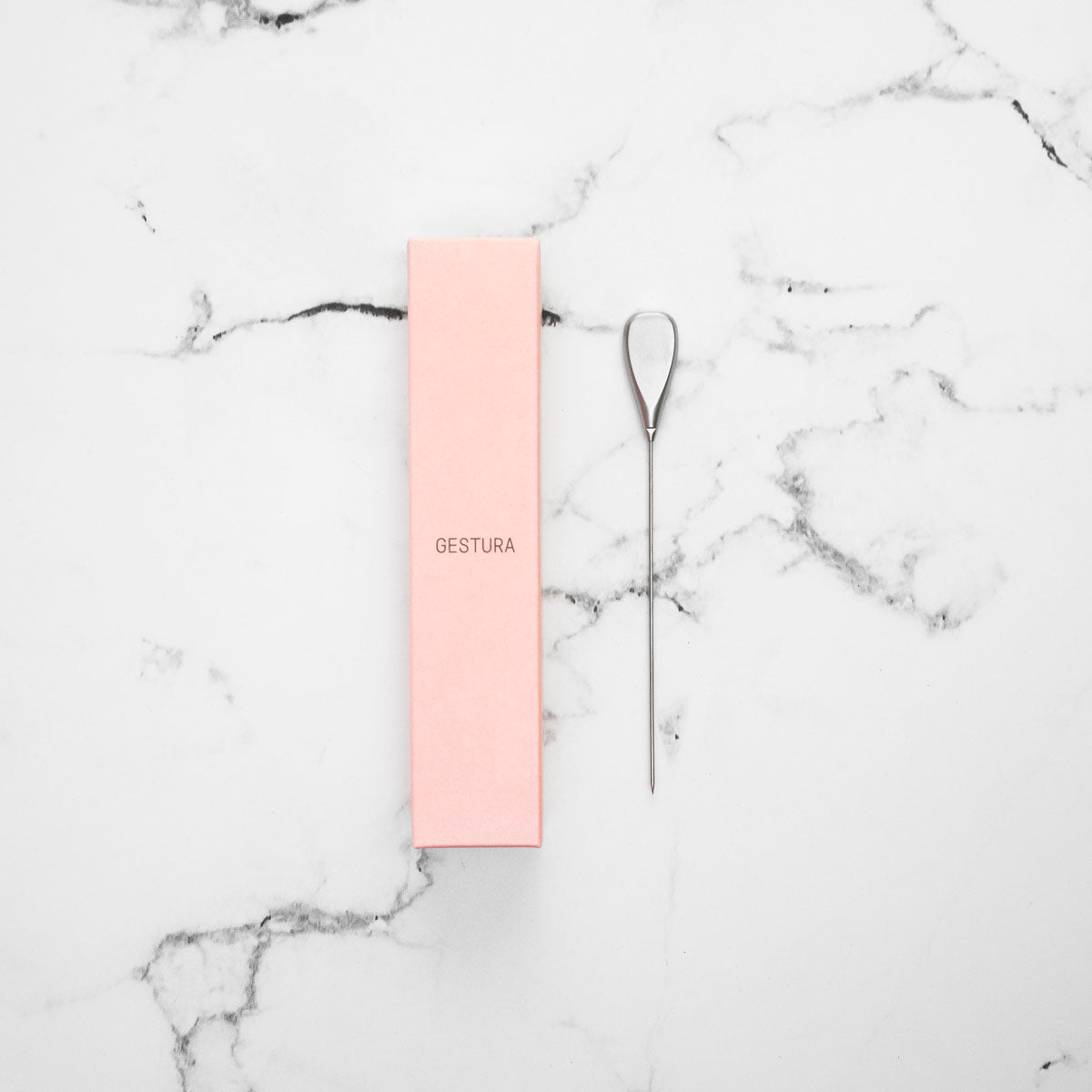 A cake tester that doesn’t melt, snap, or separate. Noyau is built with tough Japanese steel, a more fitting material than the polyurethane often used by manufacturers. Taking inspiration from cocktail pins found at bars and antique shops in Kyoto, Noyau's head is stamped flat to feel like a weighted guitar pick, and pinched at the base to keep the rod firmly in place. The tip is pointed, to mimic a toothpick and slide through meat, fish, cake, and veg without damaging flesh, fiber, or crumb.