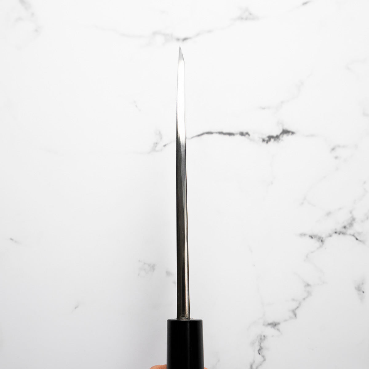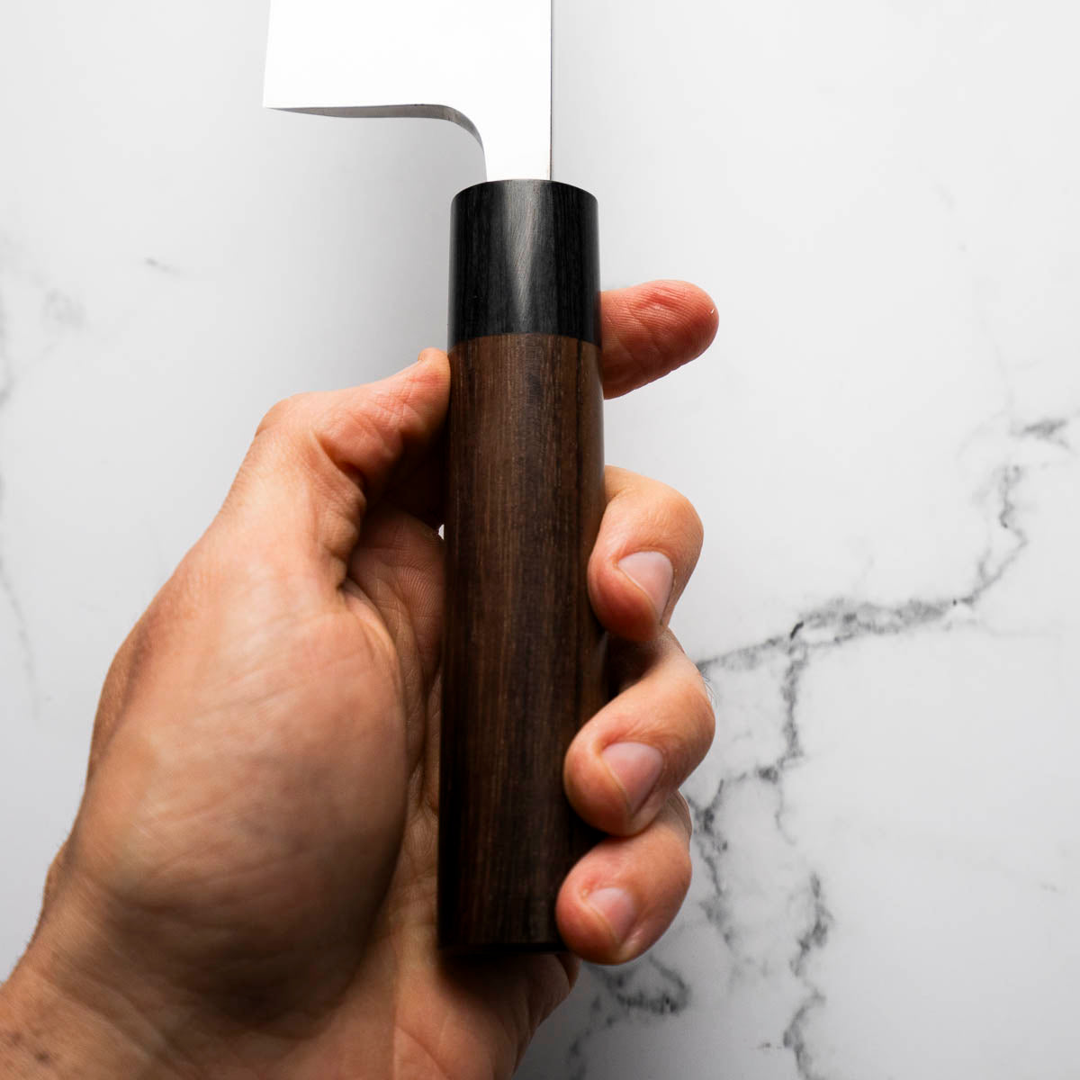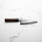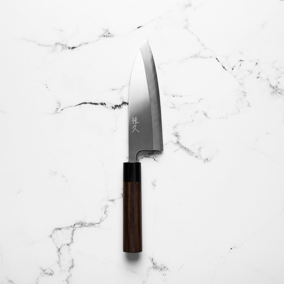 The Deba knife, deeply rooted in Japanese culinary tradition, is a robust, single-bevel knife (sometimes double) primarily designed for fileting fish. Its thick, heavy blade effortlessly glides through fish bones and joints, while preserving delicate flesh. Ideal for seafood preparation, the Deba is a staple in Japanese kitchens for its precision and strength.