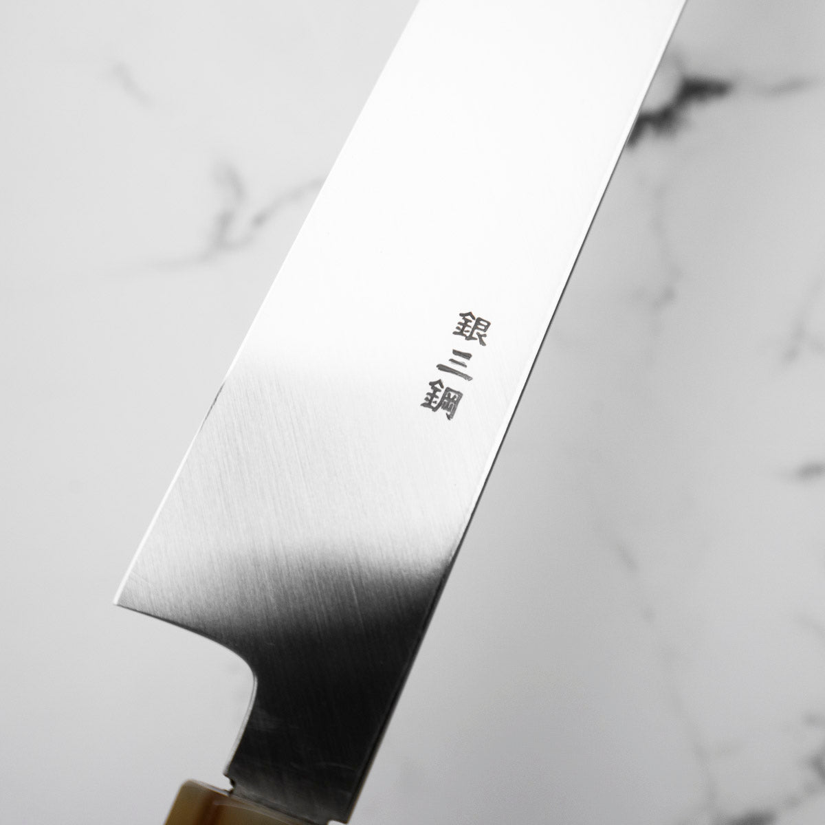 Japanese Ginsan steel, also known as Silver-3 or G3, is an underrated high-grade semi-stainless steel loved by many for being in the ‘goldilocks zone’ of knife steels. It holds a very respectable edge, but is effortless to sharpen. It is considered the semi-stainless version of White 2. It is the knife steel of choice for many home cooks and professional chefs alike.