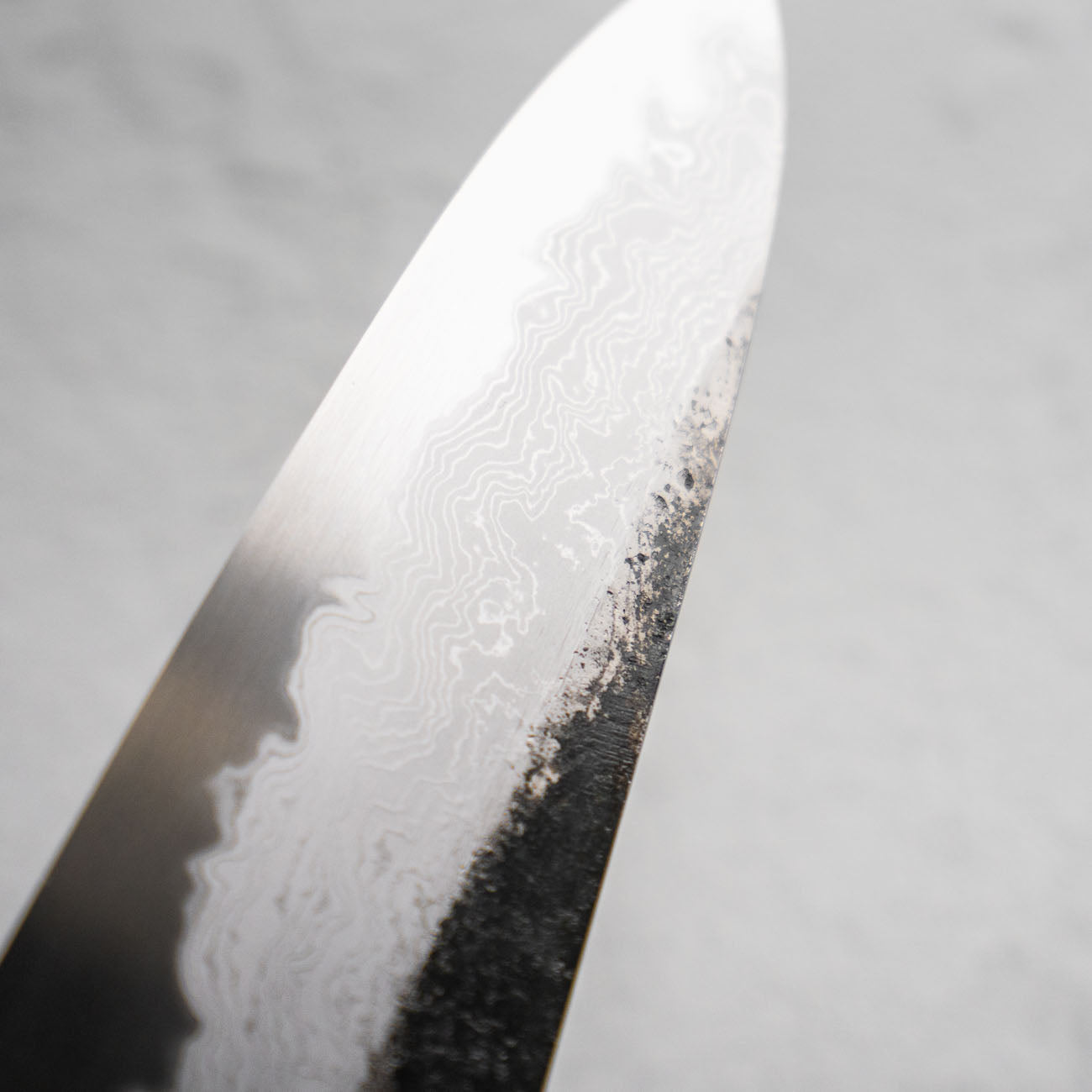 This knife is made from a high-carbon steel and as such, will require a little more care than a regular off-the-shelf knife. It must be dried shortly after use, as prolonged exposure to moisture can cause rust spots to appear. A very light coat of oil during storage also helps to prevent rust spots. A patina (colouration and seasoning of the steel) will occur with use.