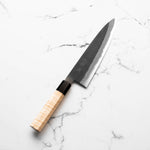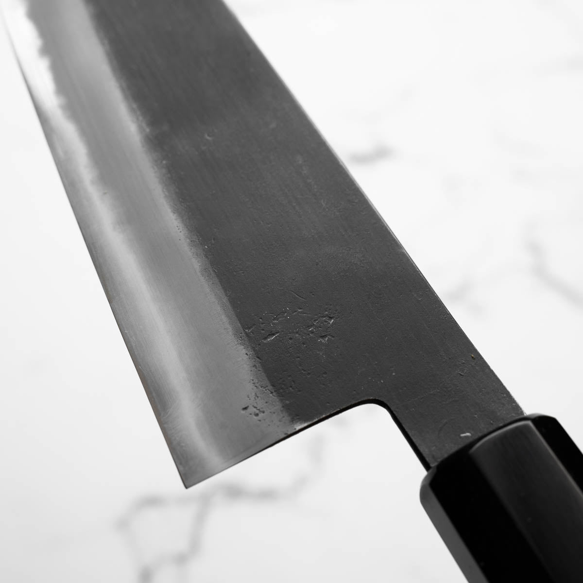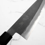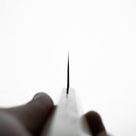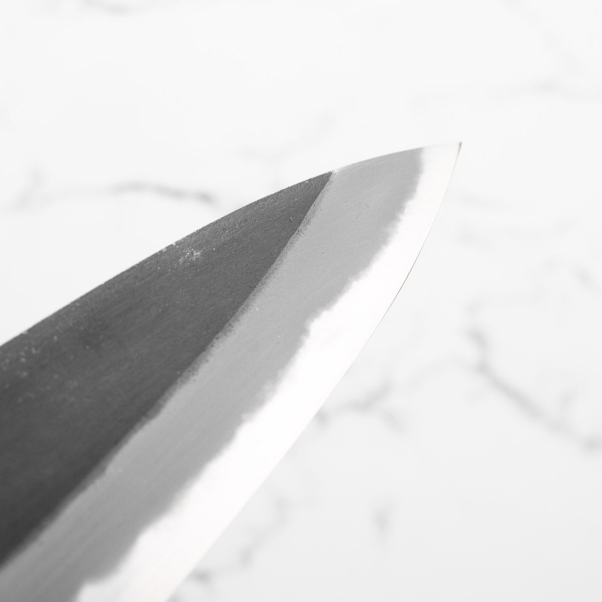 Japanese White Steel #2, a traditional high-carbon steel, is cherished for its purity and fine grain structure, enabling razor-sharp edges, at the cost of being reactive. It is one of the easiest steels to sharpen, but cannot be left wet for even short periods otherwise rust spots can occur. If you’re fastidious in your knife maintenance, this knife steel can be extremely rewarding to use.