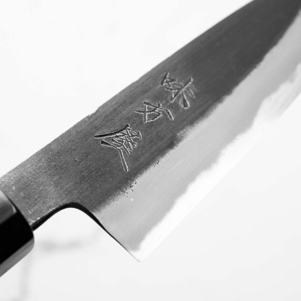Japanese White Steel #2, a traditional high-carbon steel, is cherished for its purity and fine grain structure, enabling razor-sharp edges, at the cost of being reactive. It is one of the easiest steels to sharpen, but cannot be left wet for even short periods otherwise rust spots can occur. If you’re fastidious in your knife maintenance, this knife steel can be extremely rewarding to use.