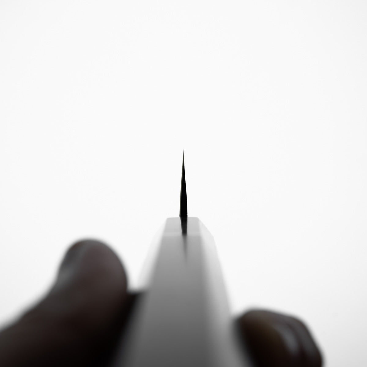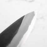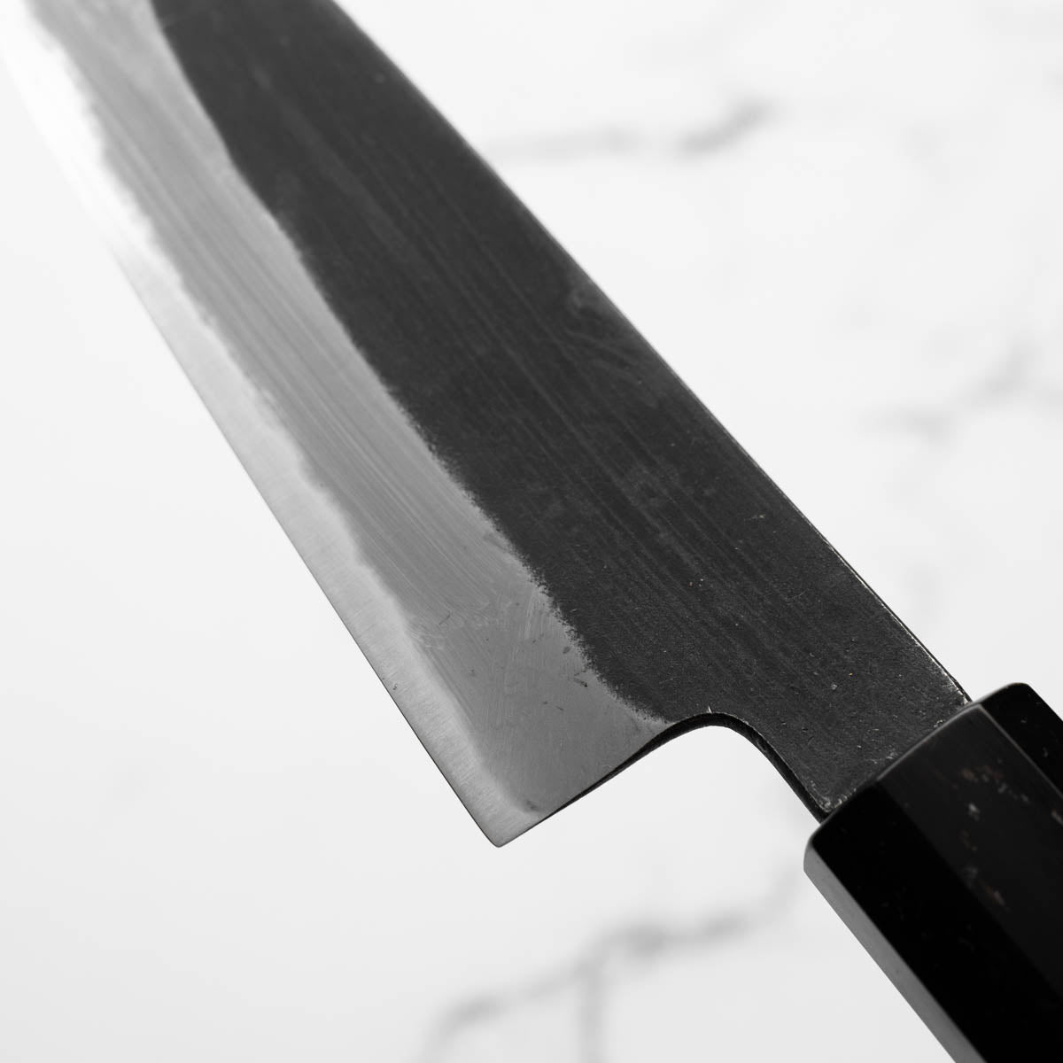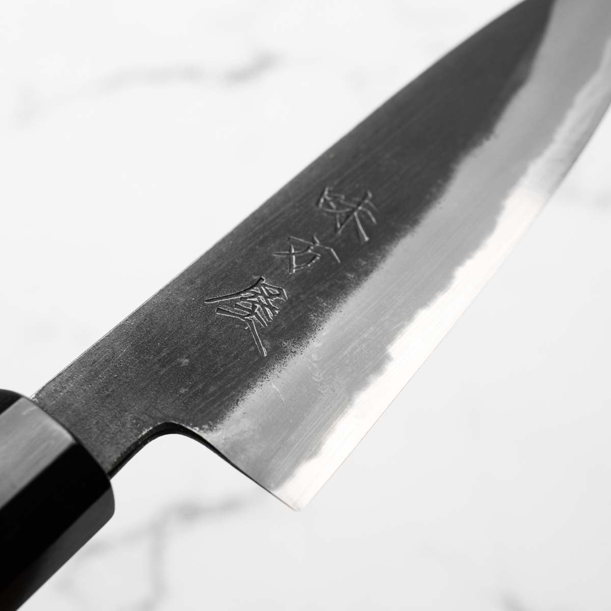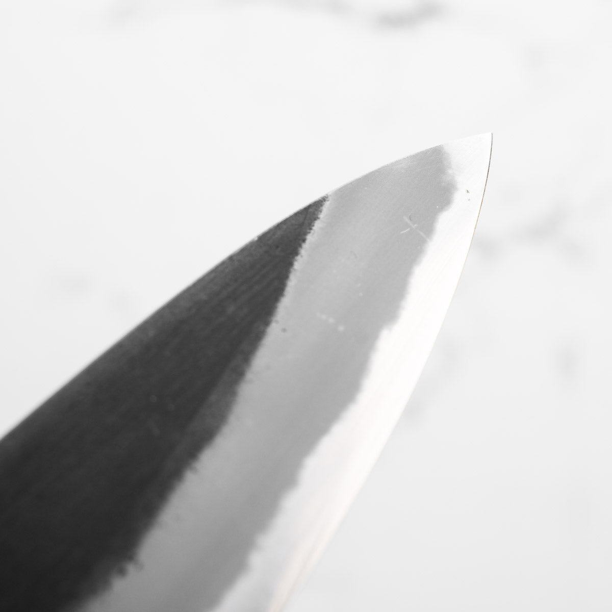 Japanese White Steel #2, a traditional high-carbon steel, is cherished for its purity and fine grain structure, enabling razor-sharp edges, at the cost of being reactive. It is one of the easiest steels to sharpen, but cannot be left wet for even short periods otherwise rust spots can occur. If you’re fastidious in your knife maintenance, this knife steel can be extremely rewarding to use.
