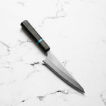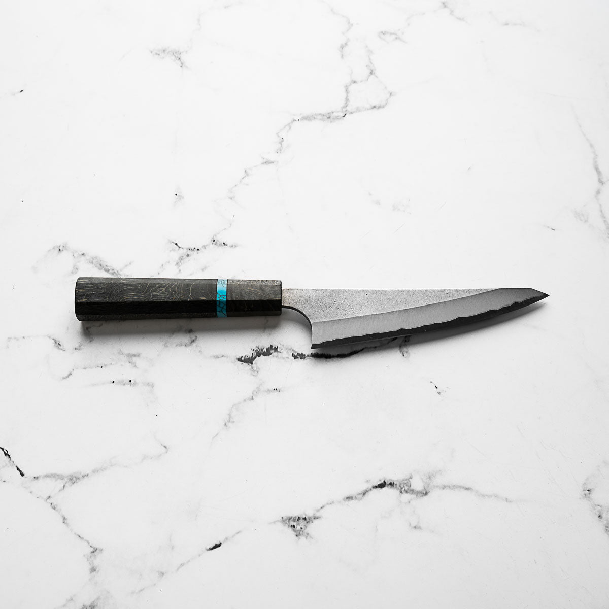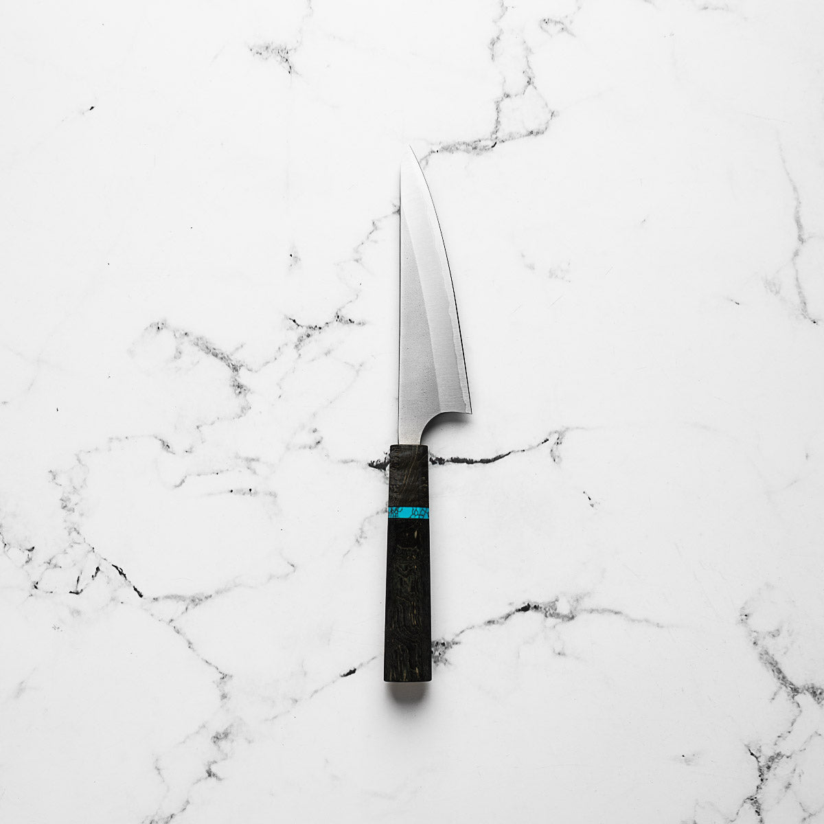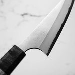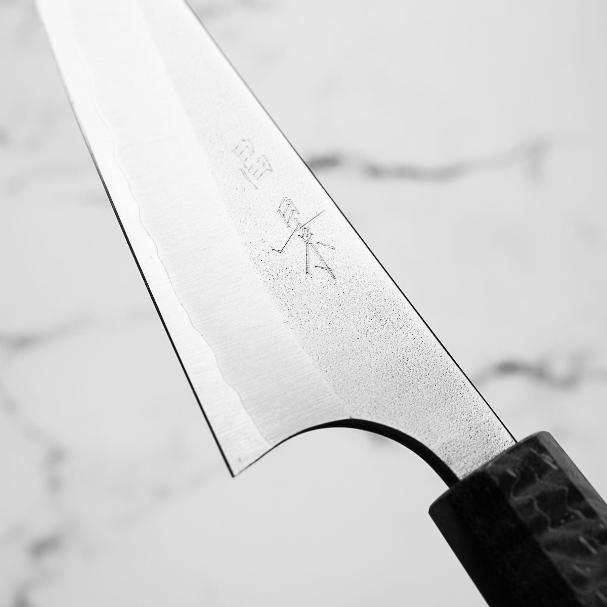 Japanese White Steel #2, a traditional high-carbon steel, is cherished for its purity and fine grain structure, enabling razor-sharp edges, at the cost of being reactive. It is one of the easiest steels to sharpen, but cannot be left wet for even short periods otherwise rust spots can occur. If you’re fastidious in your knife maintenance, this knife steel can be extremely rewarding to use.