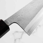 One of their most celebrated offerings is the SKD steel series — featuring a semi-stainless high-carbon core clad in stainless steel. The blades showcase a distinctive wide-bevel grind with a shallow hammer texture that sits stylistically between nashiji and kurouchi finishes. Paired with traditional burnt chestnut handles, each knife reflects Yoshikane’s dedication to consistency, craftsmanship, and timeless design.