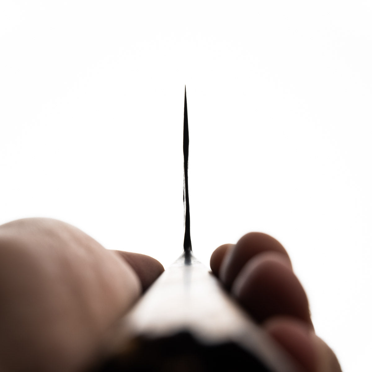 This knife is made from a high-carbon steel and as such, will require a little more care than a regular off-the-shelf knife. It must be dried shortly after use, as prolonged exposure to moisture can cause rust spots to appear. A very light coat of oil during storage also helps to prevent rust spots. A patina (colouration and seasoning of the steel) will occur with use.