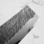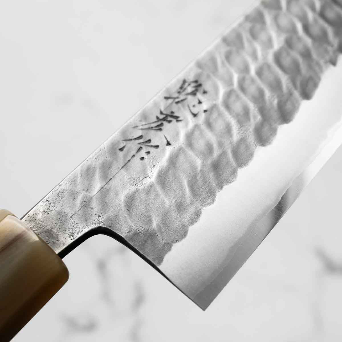 Japanese White Steel #2, a traditional high-carbon steel, is cherished for its purity and fine grain structure, enabling razor-sharp edges, at the cost of being reactive. It is one of the easiest steels to sharpen, but cannot be left wet for even short periods otherwise rust spots can occur. If you’re fastidious in your knife maintenance, this knife steel can be extremely rewarding to use.
