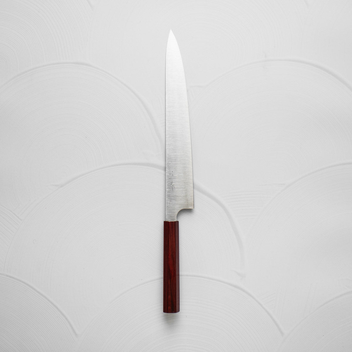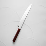 The Sujihiki knife, a traditional Japanese slicer, is designed for carving and fileting. With its long, narrow blade, typically ranging from 240mm to 330mm, it excels in creating clean, smooth cuts through meat and fish. Its length ensures long, uninterrupted strokes, making it perfect for precise slicing tasks.