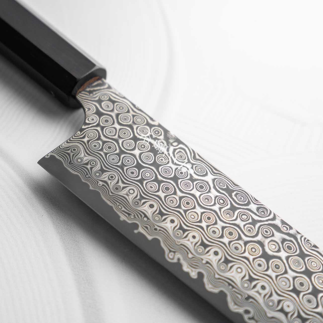 Nigara Hamono are truly some of the most experienced knifemakers in Japan. Now on their 8th generation of blacksmiths, they are masters at stainless damascus forging and heat treatment. The Anmon Damascus we have available have a matte finish and are polished underneath, resulting in a brilliant visual contrast.