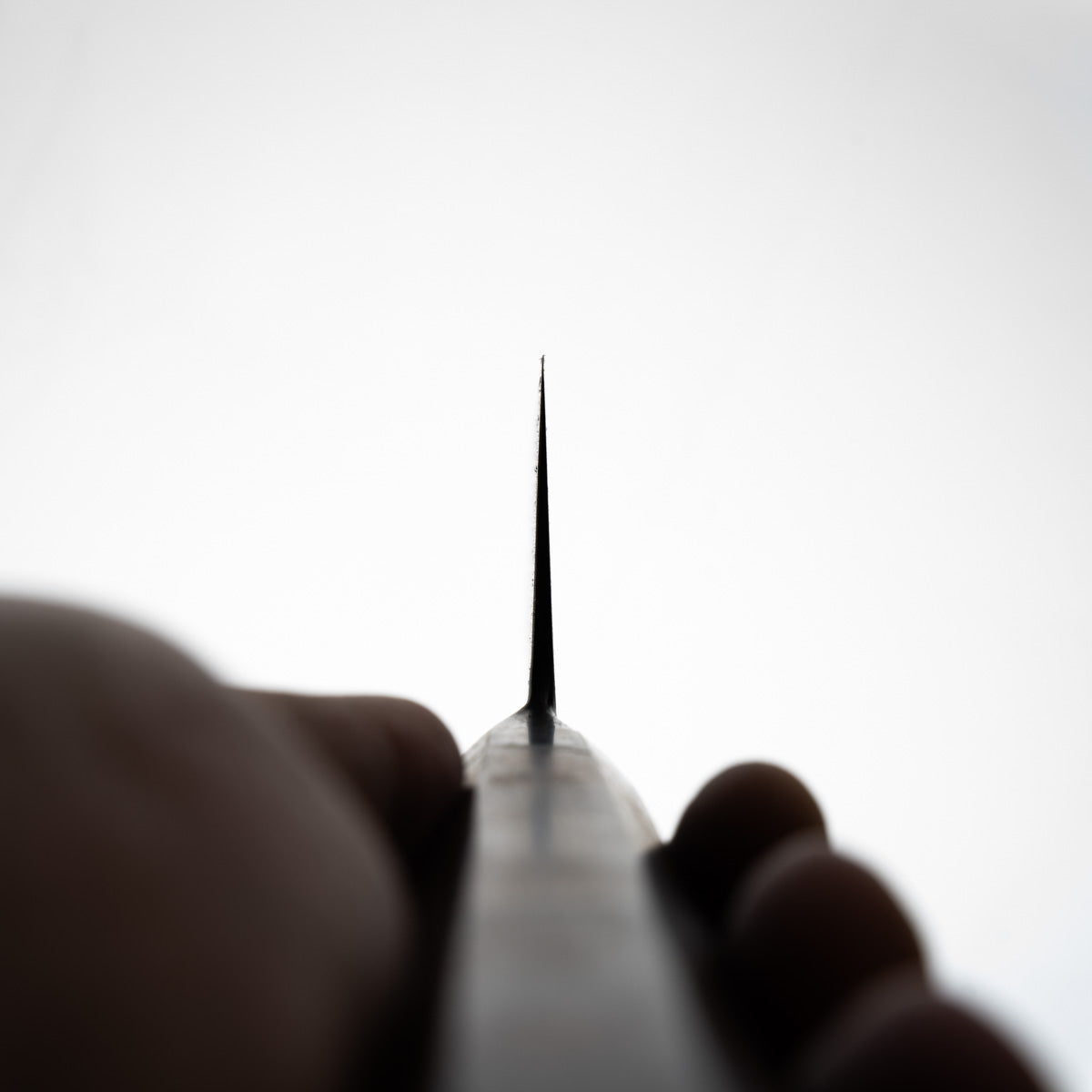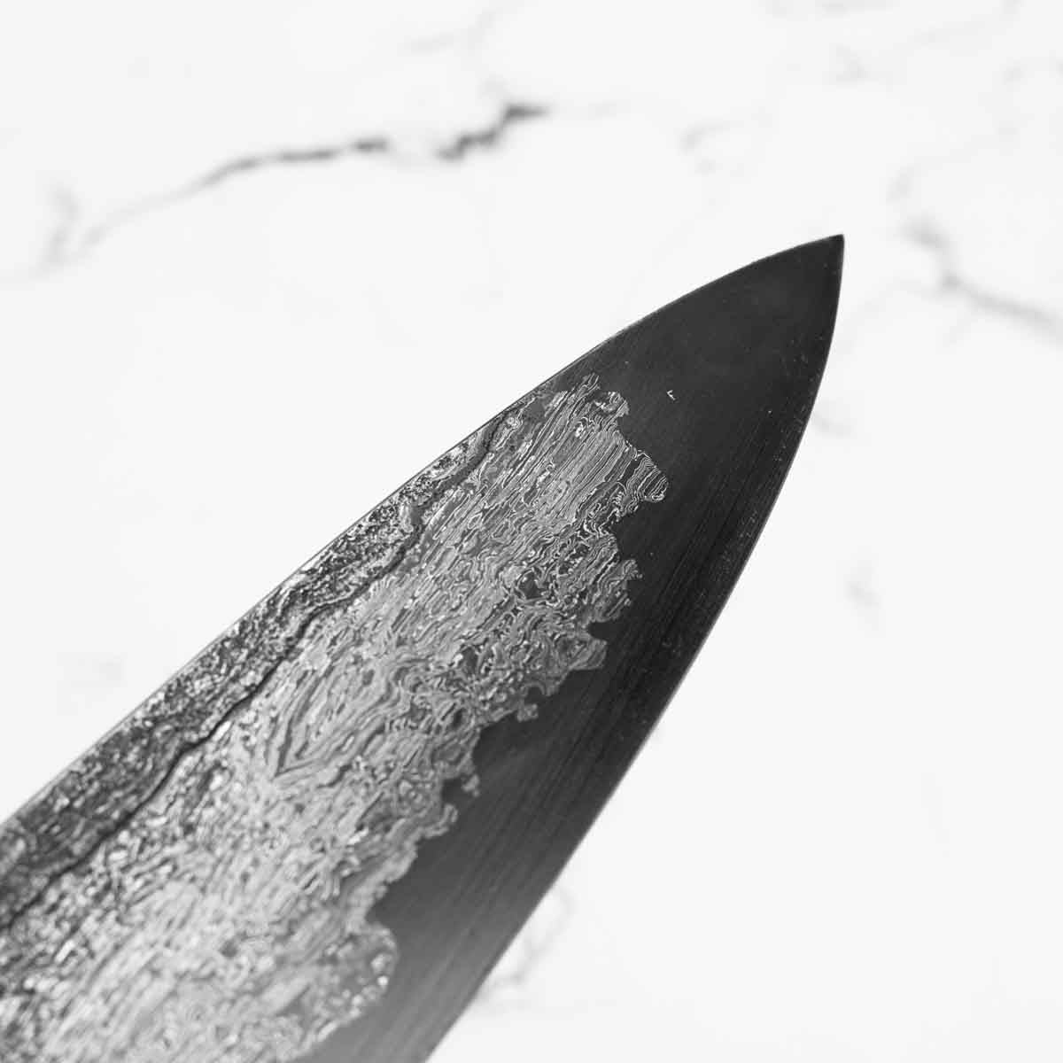 This knife is made from a high-carbon steel and as such, will require a little more care than a regular off-the-shelf knife. It must be dried shortly after use, as prolonged exposure to moisture can cause rust spots to appear. A very light coat of oil during storage also helps to prevent rust spots. A patina (colouration and seasoning of the steel) will occur with use.