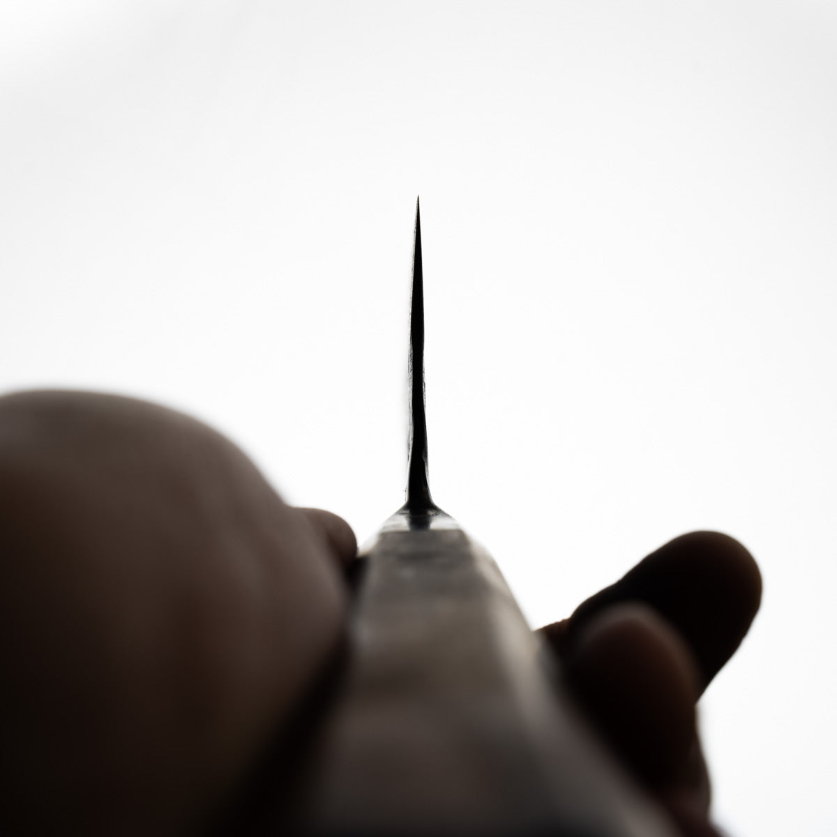 This knife is made from a high-carbon steel and as such, will require a little more care than a regular off-the-shelf knife. It must be dried shortly after use, as prolonged exposure to moisture can cause rust spots to appear. A very light coat of oil during storage also helps to prevent rust spots. A patina (colouration and seasoning of the steel) will occur with use.