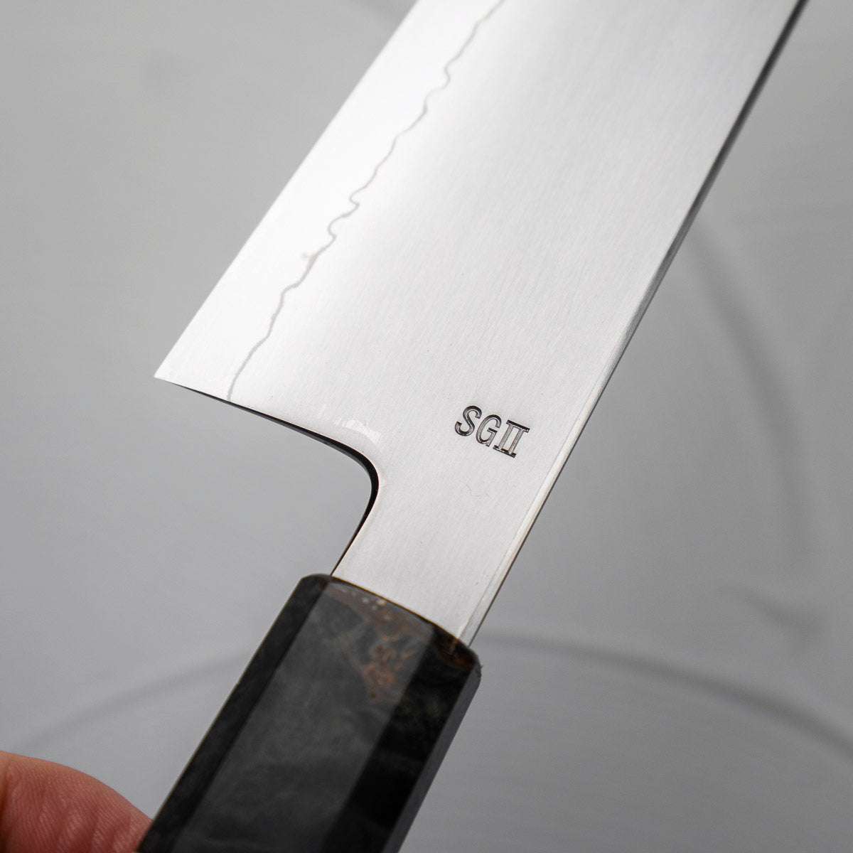 Japanese SG2, also known as R2 steel, is a high-end, powdered metallurgy stainless steel and one of the finest knife-making steels available in Japan. It is a favourite of many for its exceptional hardness and edge retention. Its fine, uniform grain structure enables razor-sharp edges, all the while holding an edge for much longer than Carbon steel knives, without needing to be concerned about rust appearing.
