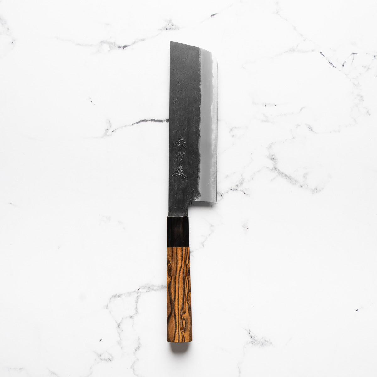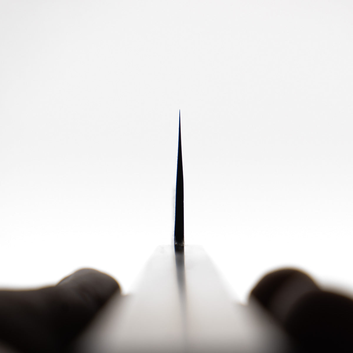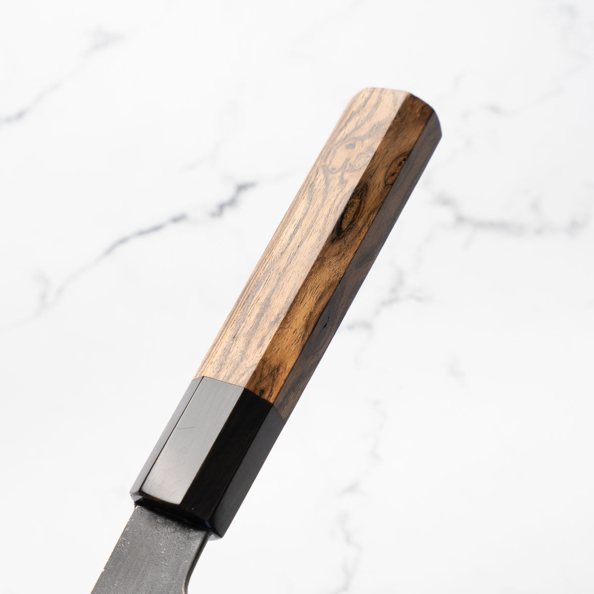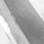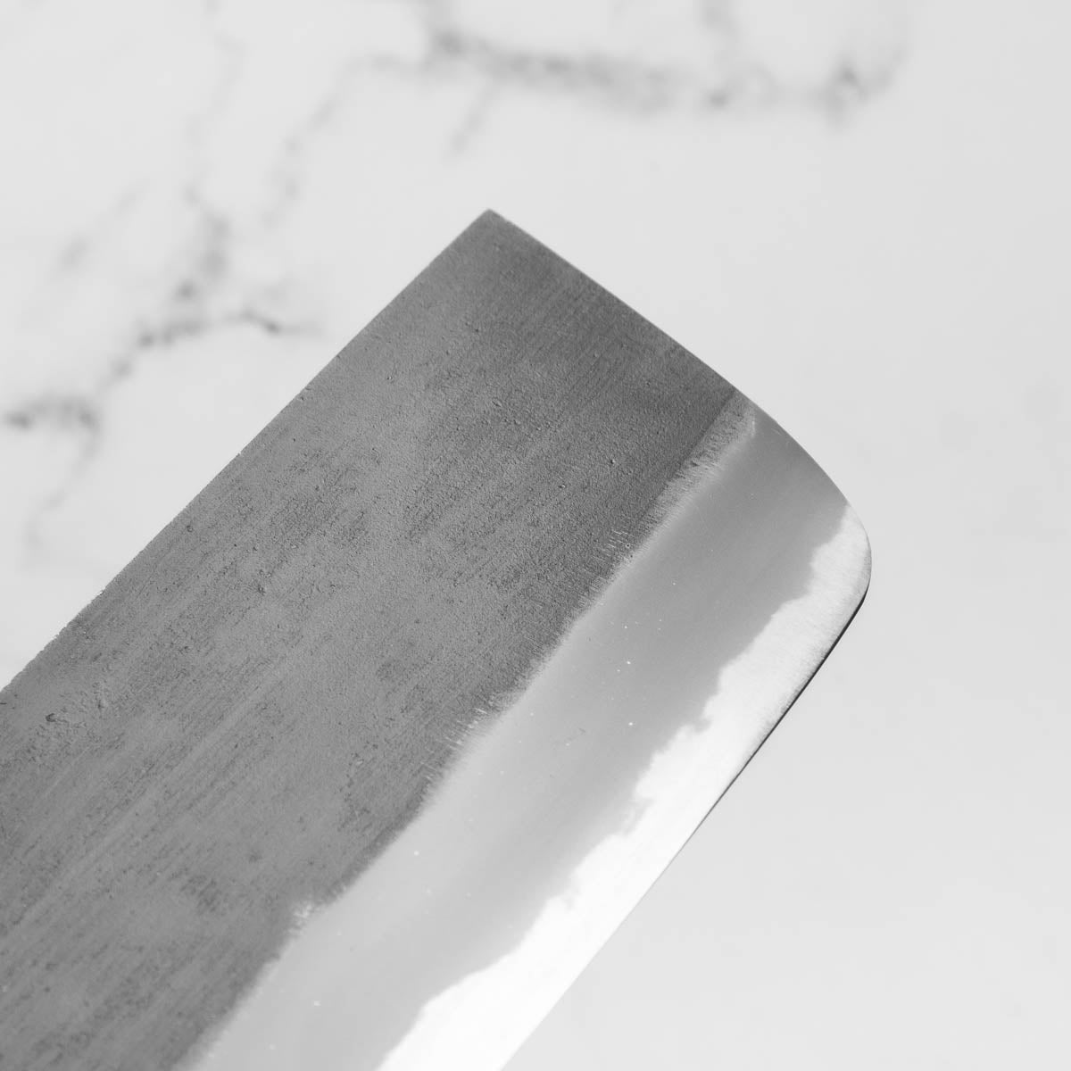 Japanese White Steel #2, a traditional high-carbon steel, is cherished for its purity and fine grain structure, enabling razor-sharp edges, at the cost of being reactive. It is one of the easiest steels to sharpen, but cannot be left wet for even short periods otherwise rust spots can occur. If you’re fastidious in your knife maintenance, this knife steel can be extremely rewarding to use.