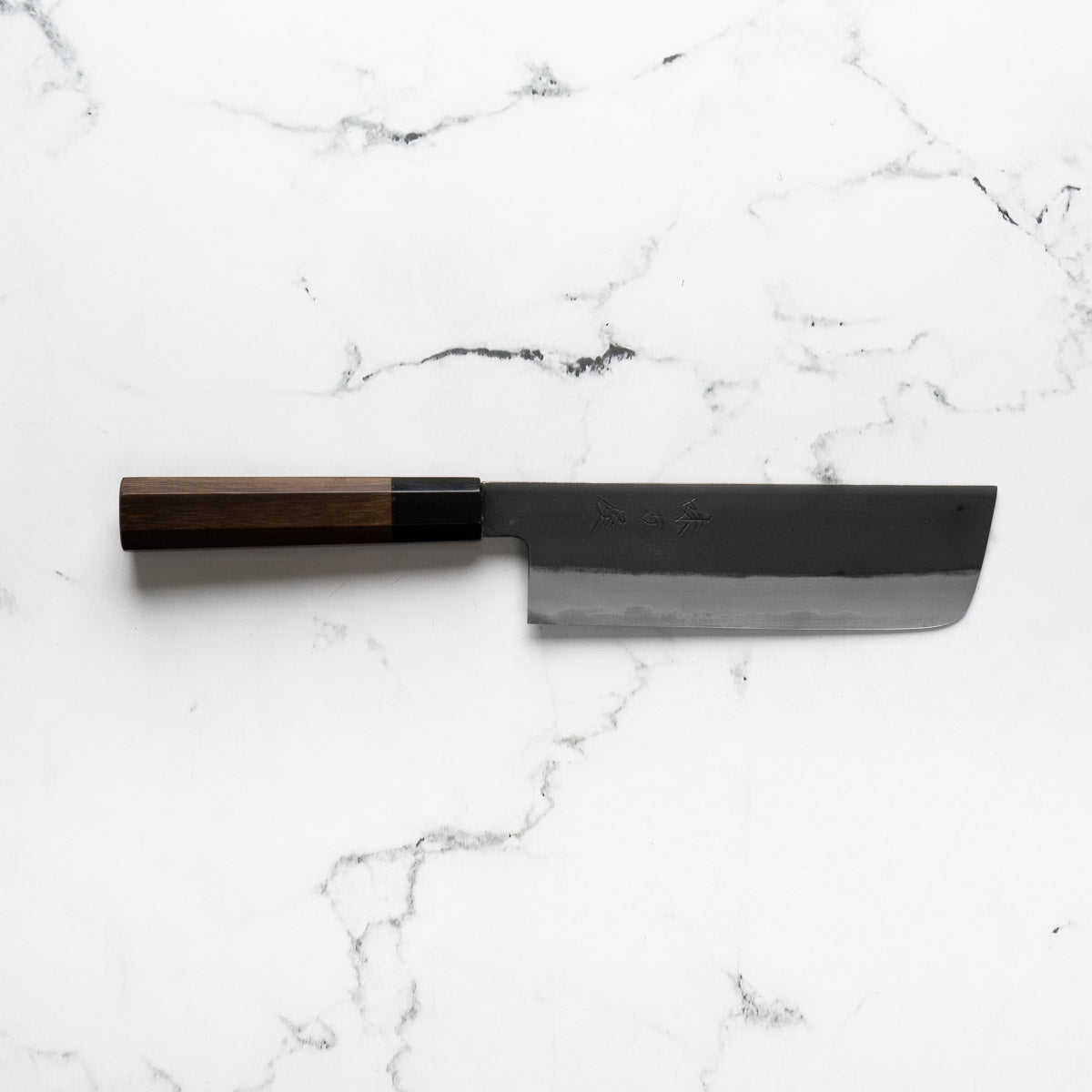 Japanese White Steel #2, a traditional high-carbon steel, is cherished for its purity and fine grain structure, enabling razor-sharp edges, at the cost of being reactive. It is one of the easiest steels to sharpen, but cannot be left wet for even short periods otherwise rust spots can occur. If you’re fastidious in your knife maintenance, this knife steel can be extremely rewarding to use.