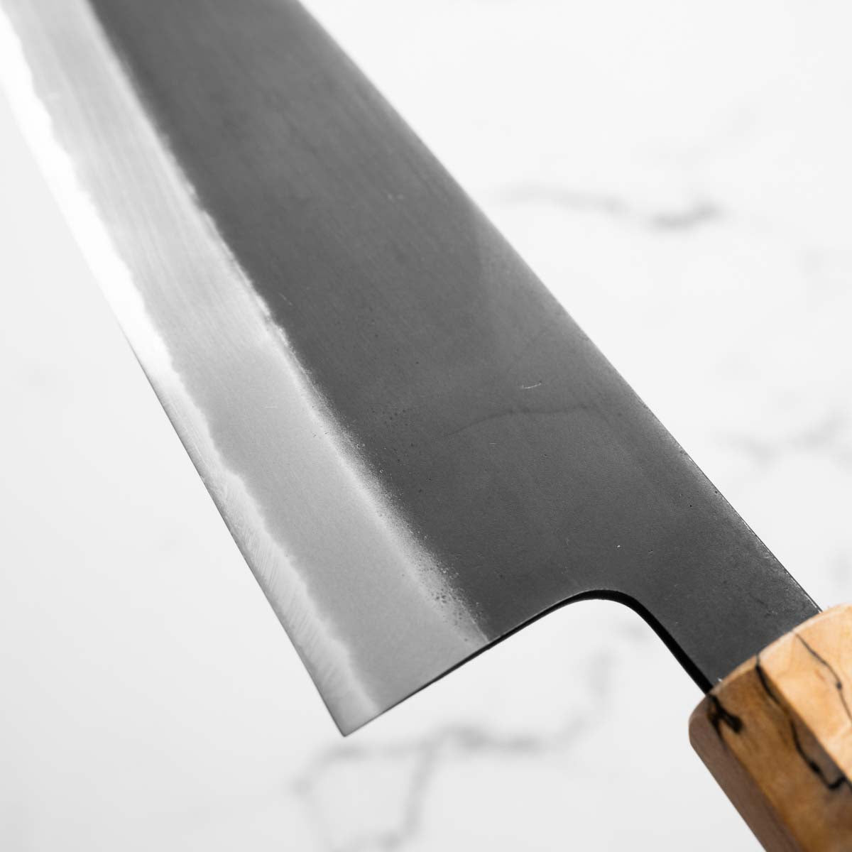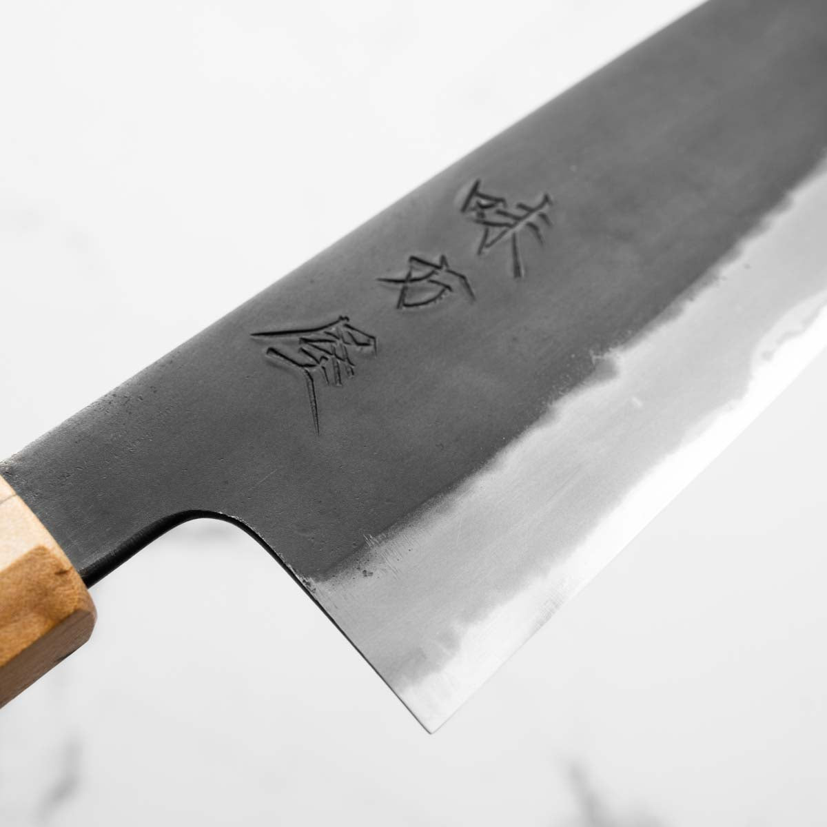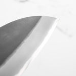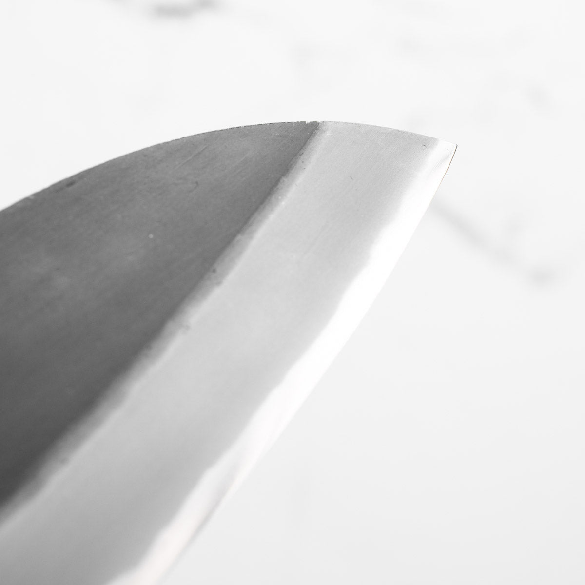 Japanese White Steel #2, a traditional high-carbon steel, is cherished for its purity and fine grain structure, enabling razor-sharp edges, at the cost of being reactive. It is one of the easiest steels to sharpen, but cannot be left wet for even short periods otherwise rust spots can occur. If you’re fastidious in your knife maintenance, this knife steel can be extremely rewarding to use.