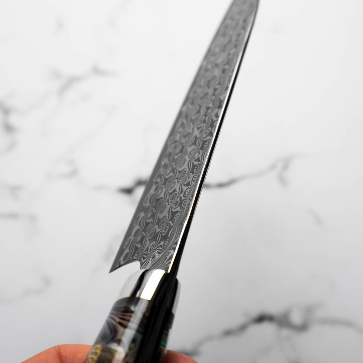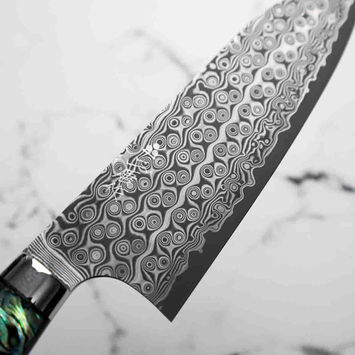 Nigara Hamono are truly some of the most experienced knifemakers in Japan. Now on their 8th generation of blacksmiths, they are masters at stainless damascus forging and heat treatment. The Anmon Damascus we have available have a matte finish and are polished underneath, resulting in a brilliant visual contrast.