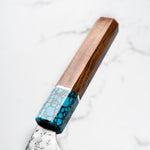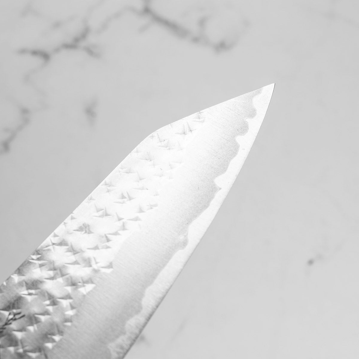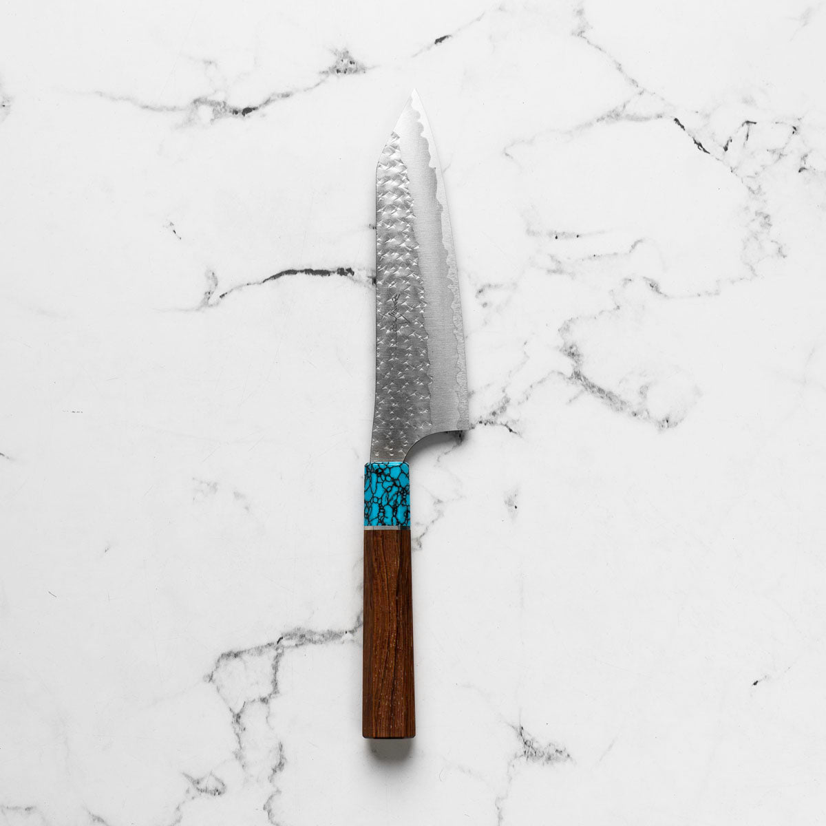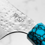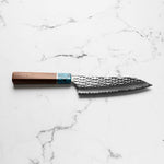 His knives are instantly recognizable for their striking Tsuchime and Suminagashi finishes, thin grinds, and use of high-performance steels such as SG2, HAP40, and stainless-clad Blue Super. Kurosaki’s Fujin series, with its dramatic wind-patterned hammer finish, helped cement his reputation as a blacksmith who blends artistry and technical brilliance in equal measure.