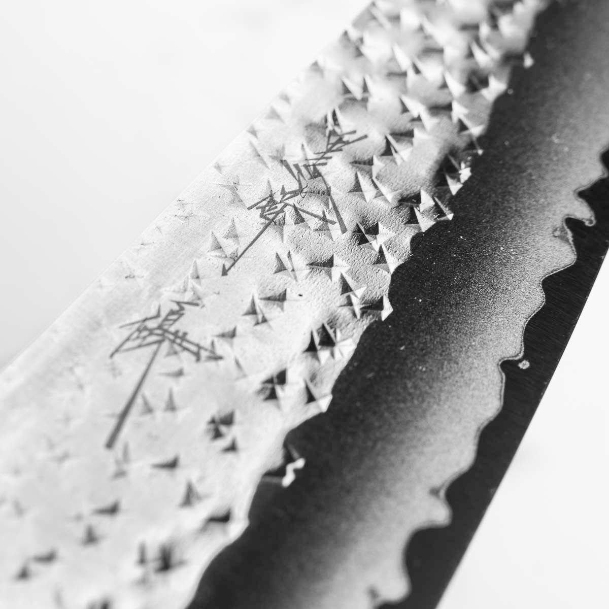 This knife is made from a high-carbon steel and as such, will require a little more care than a regular off-the-shelf knife. It must be dried shortly after use, as prolonged exposure to moisture can cause rust spots to appear. A very light coat of oil during storage also helps to prevent rust spots. A patina (colouration and seasoning of the steel) will occur with use.