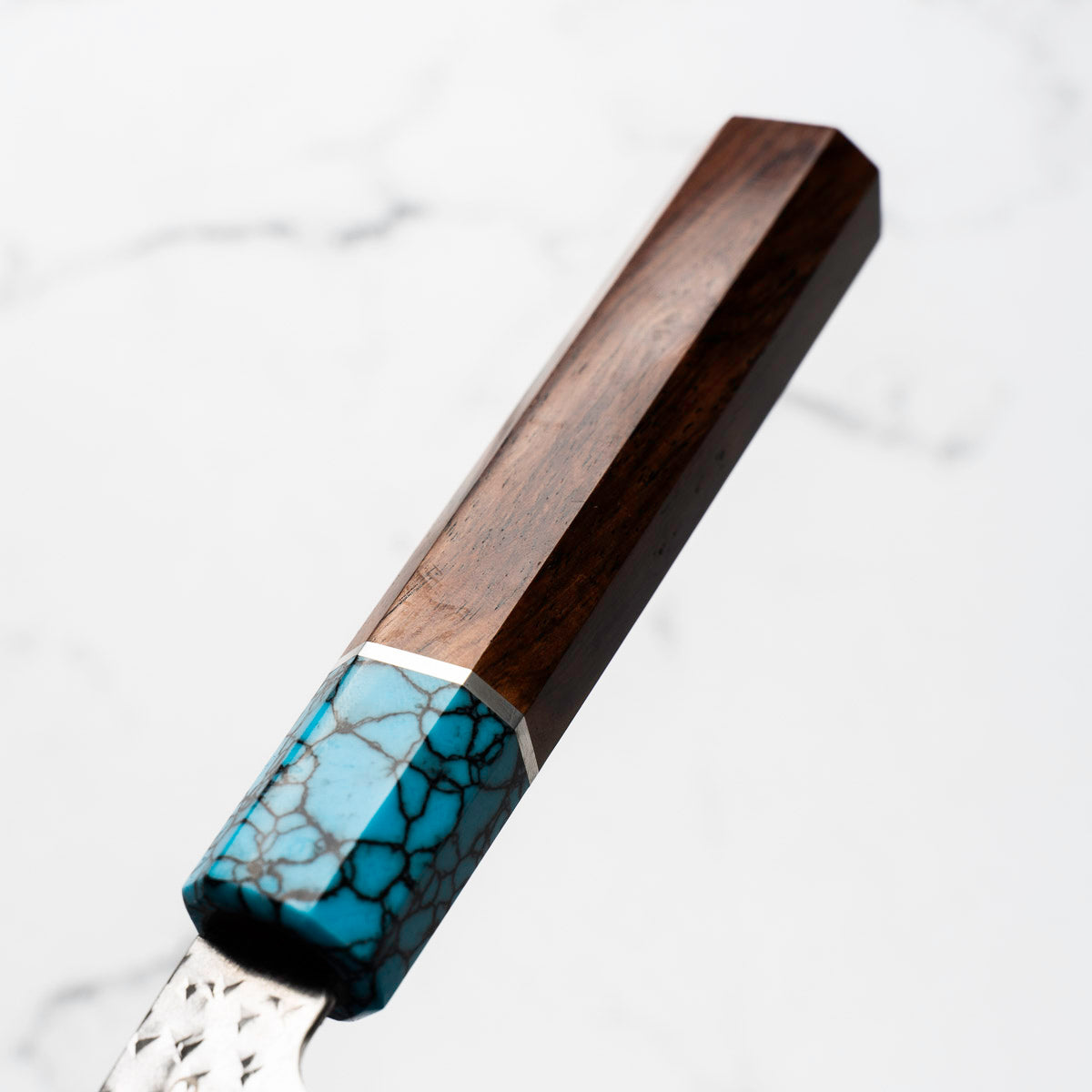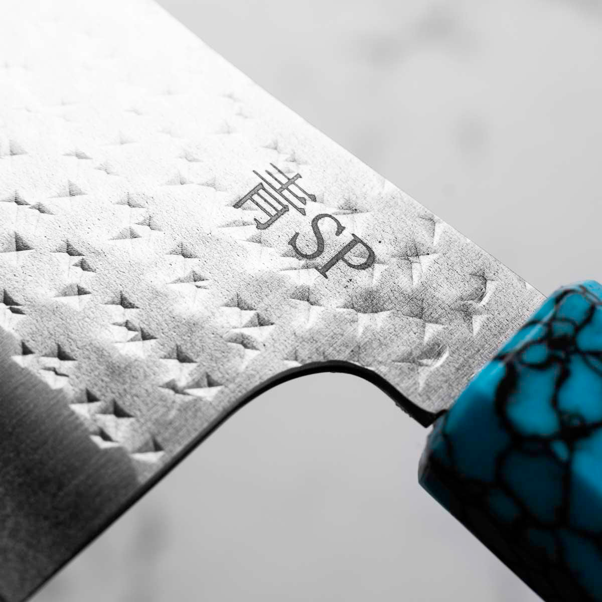 His knives are instantly recognizable for their striking Tsuchime and Suminagashi finishes, thin grinds, and use of high-performance steels such as SG2, HAP40, and stainless-clad Blue Super. Kurosaki’s Fujin series, with its dramatic wind-patterned hammer finish, helped cement his reputation as a blacksmith who blends artistry and technical brilliance in equal measure.