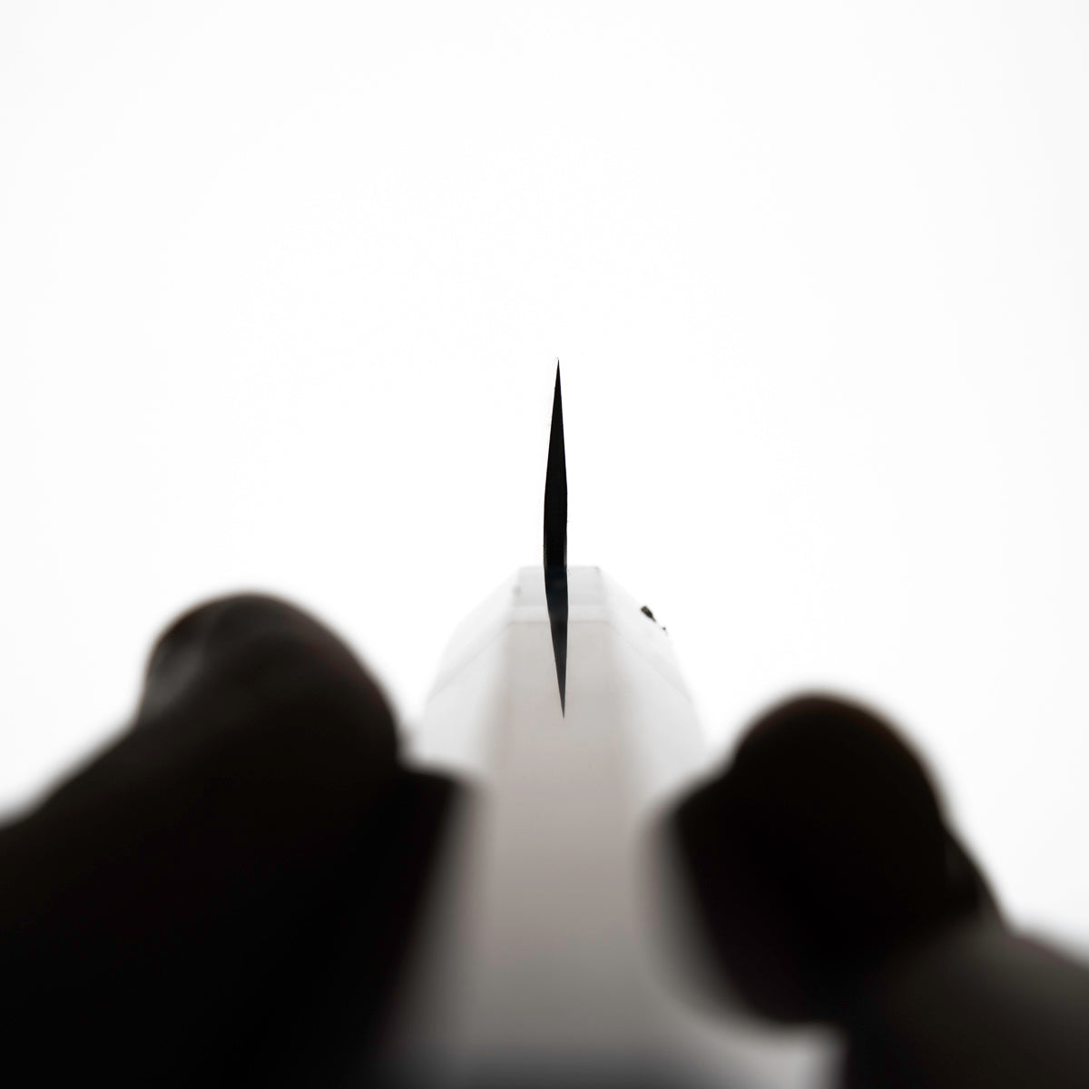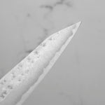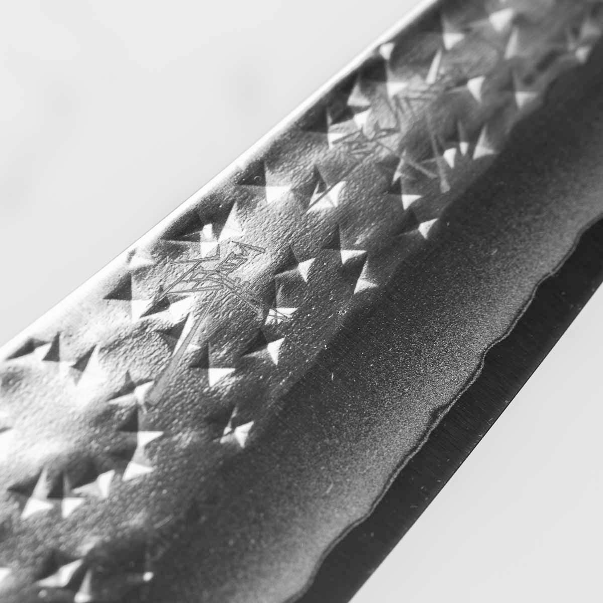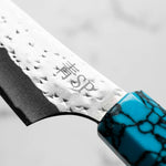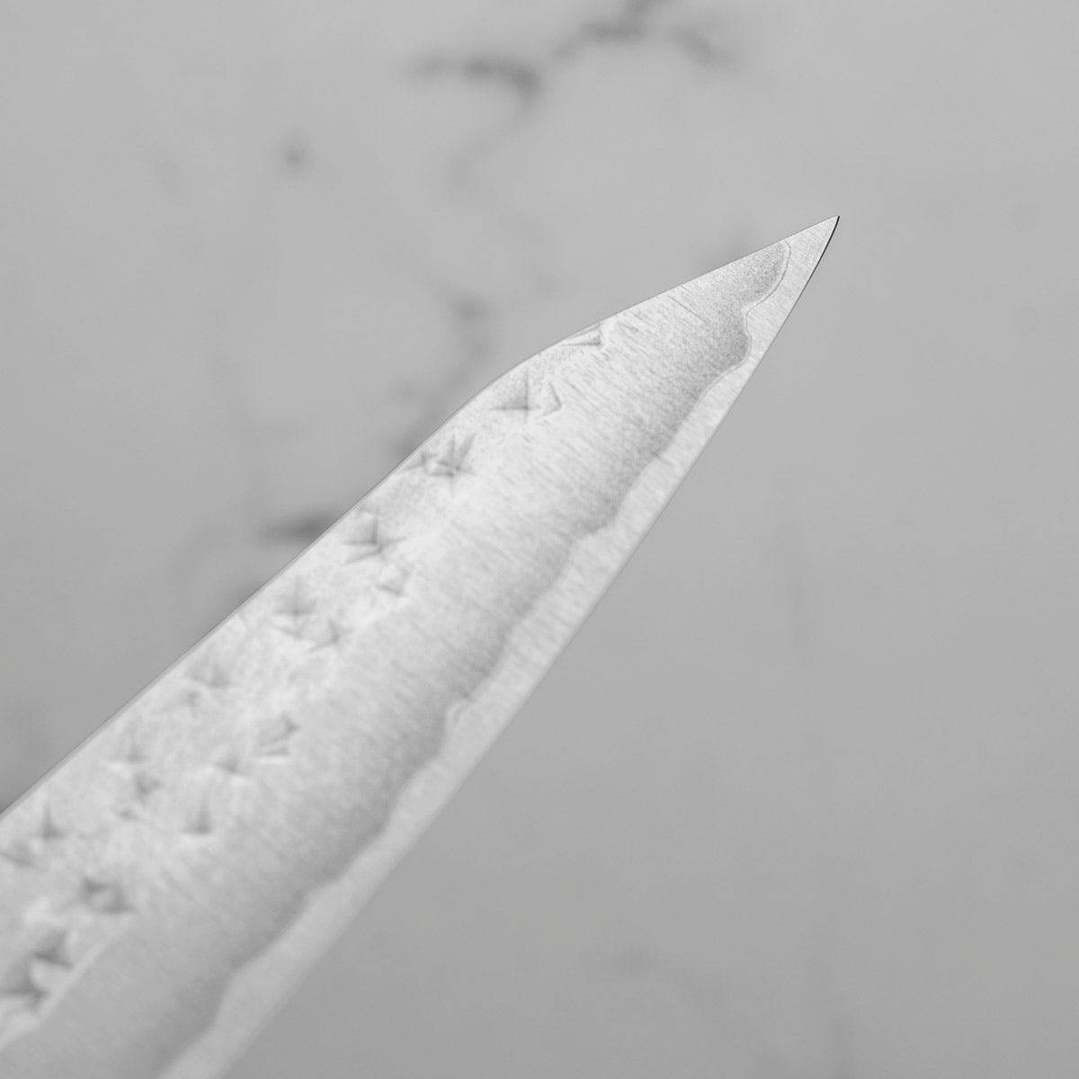 His knives are instantly recognizable for their striking Tsuchime and Suminagashi finishes, thin grinds, and use of high-performance steels such as SG2, HAP40, and stainless-clad Blue Super. Kurosaki’s Fujin series, with its dramatic wind-patterned hammer finish, helped cement his reputation as a blacksmith who blends artistry and technical brilliance in equal measure.