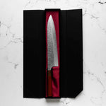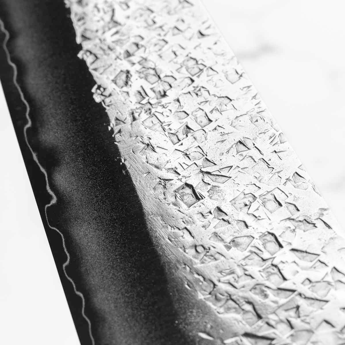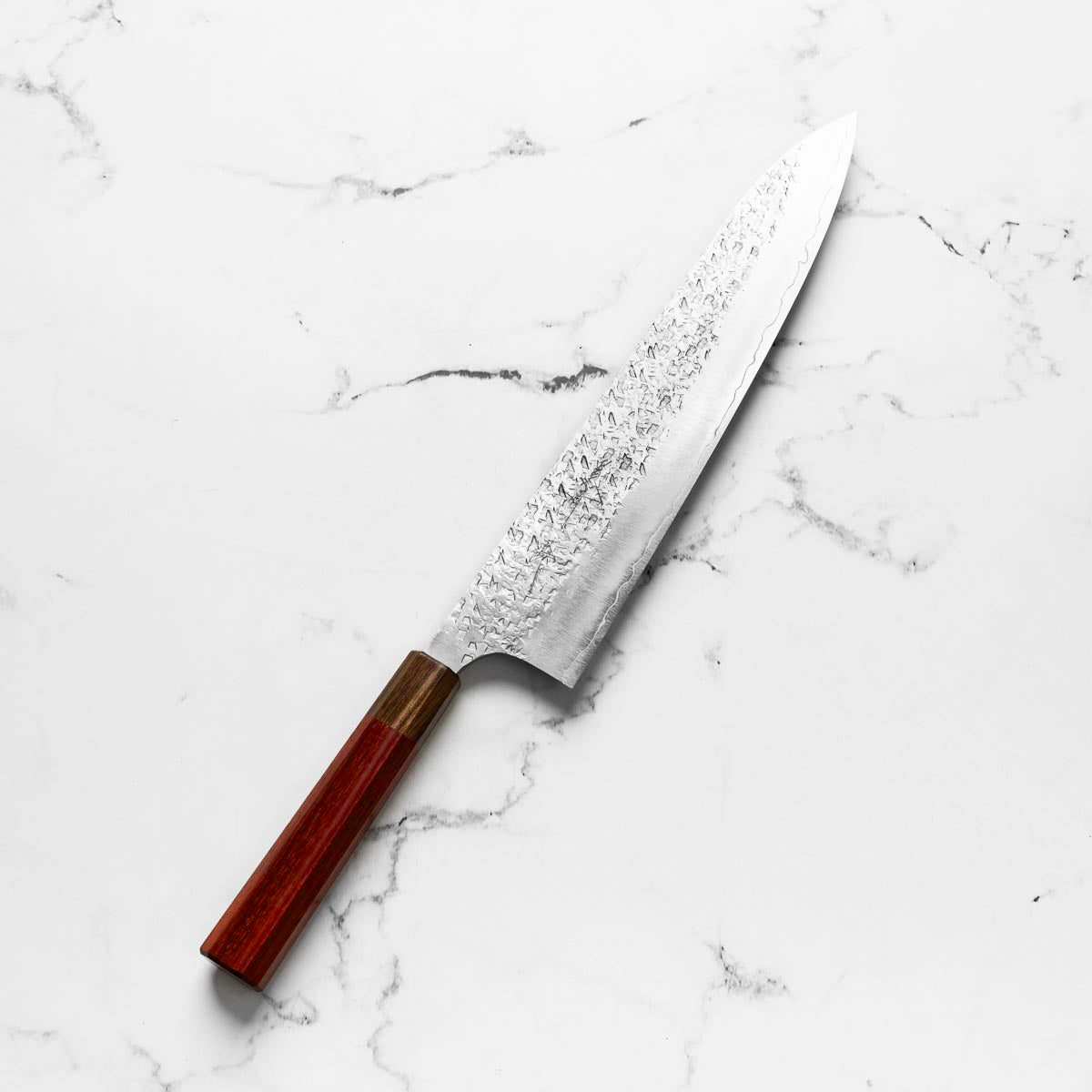 His knives are instantly recognizable for their striking Tsuchime and Suminagashi finishes, thin grinds, and use of high-performance steels such as SG2, HAP40, and stainless-clad Blue Super. Kurosaki’s Fujin series, with its dramatic wind-patterned hammer finish, helped cement his reputation as a blacksmith who blends artistry and technical brilliance in equal measure.
