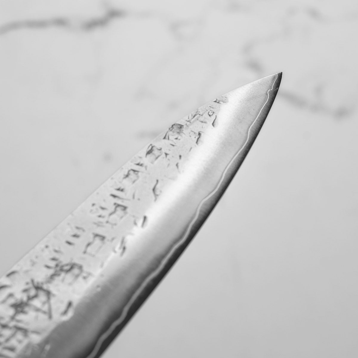 His knives are instantly recognizable for their striking Tsuchime and Suminagashi finishes, thin grinds, and use of high-performance steels such as SG2, HAP40, and stainless-clad Blue Super. Kurosaki’s Fujin series, with its dramatic wind-patterned hammer finish, helped cement his reputation as a blacksmith who blends artistry and technical brilliance in equal measure.