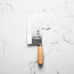 A Chinese cleaver, known as a Cai Dao, is a multipurpose kitchen knife traditional in Chinese cuisine. Characterized by its large, rectangular blade, it excels in chopping, slicing, and mincing. Despite its robust appearance, it's designed for precision tasks, from slicing meat to finely mincing herbs and vegetables.