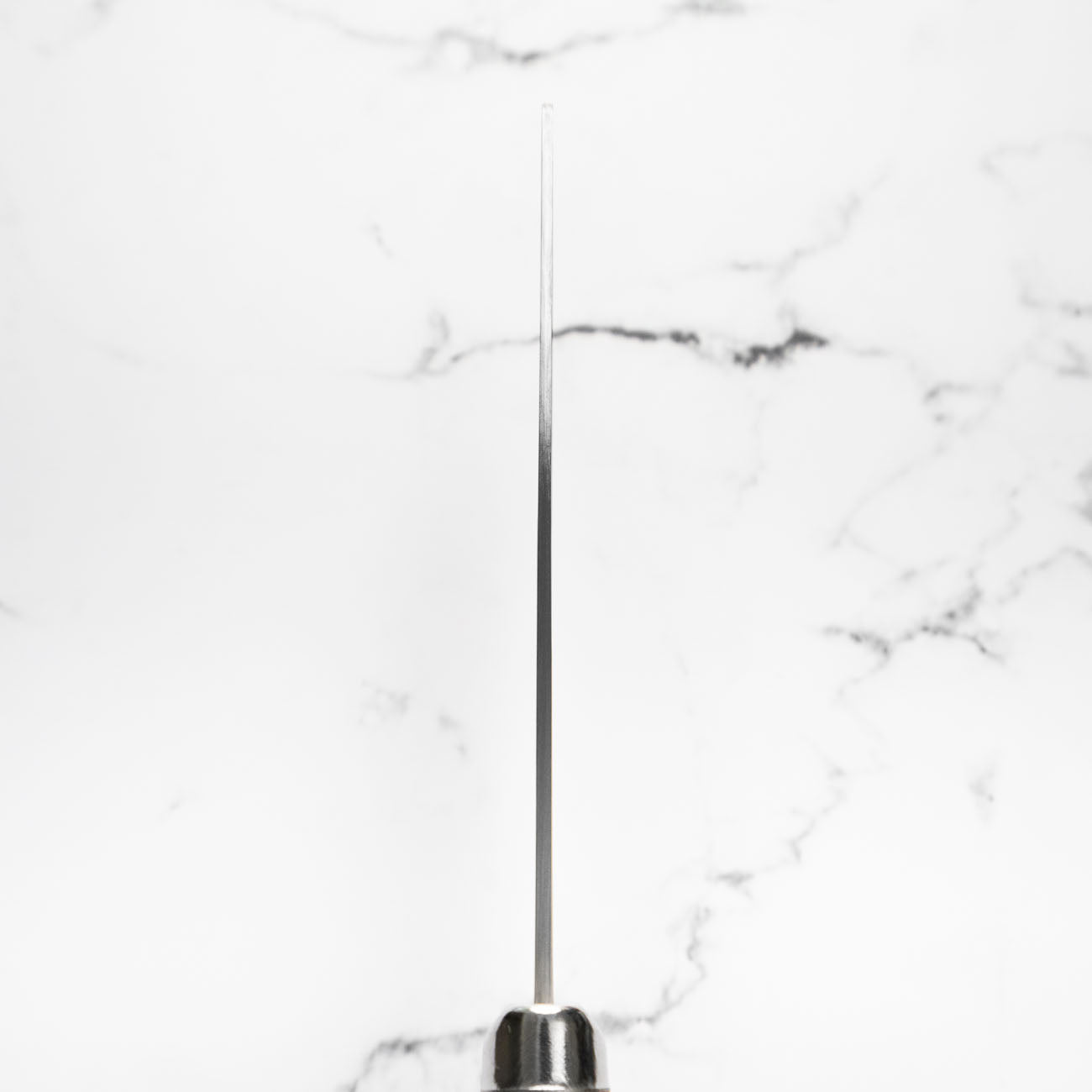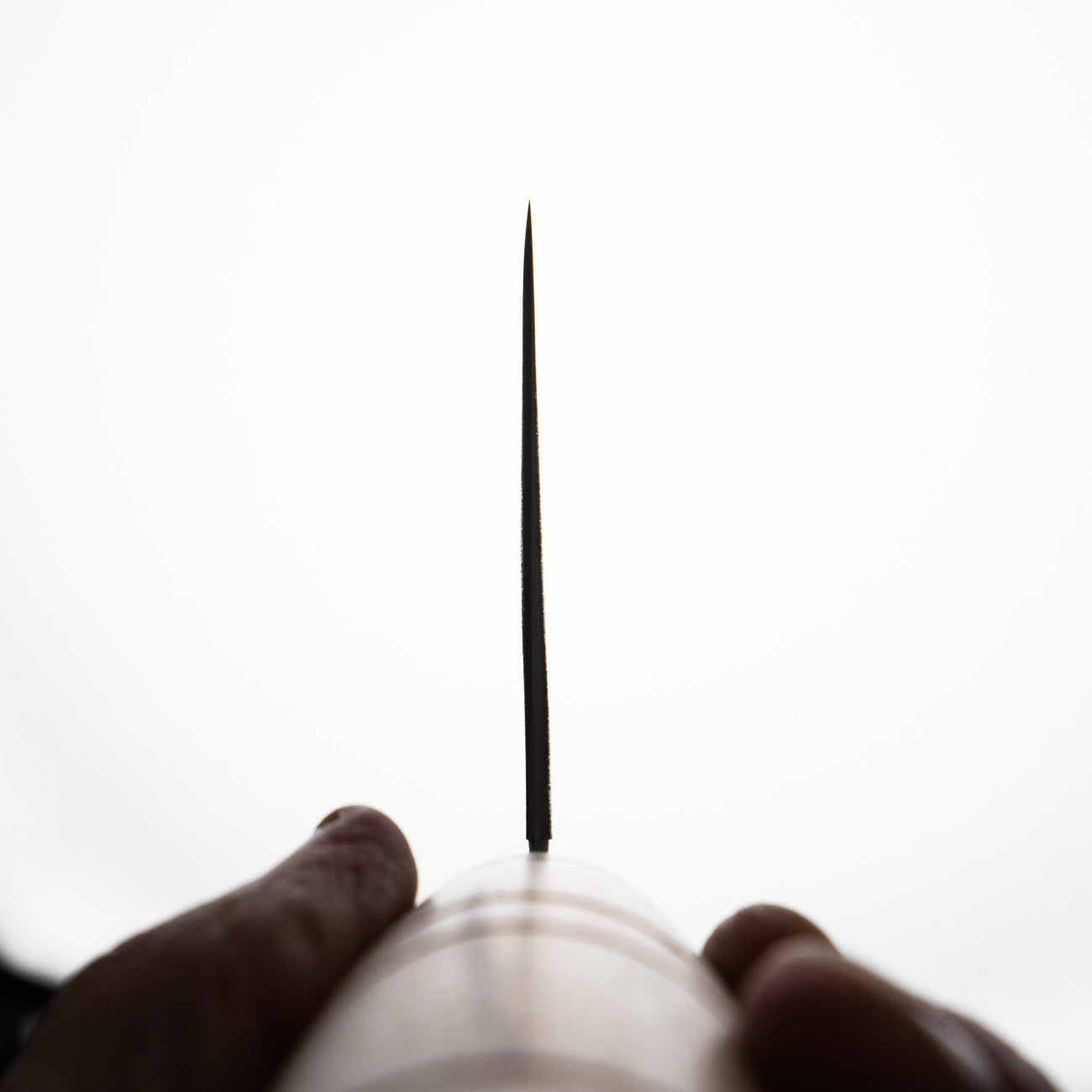 Japanese White Steel #2, a traditional high-carbon steel, is cherished for its purity and fine grain structure, enabling razor-sharp edges, at the cost of being reactive. It is one of the easiest steels to sharpen, but cannot be left wet for even short periods otherwise rust spots can occur. If you’re fastidious in your knife maintenance, this knife steel can be extremely rewarding to use.