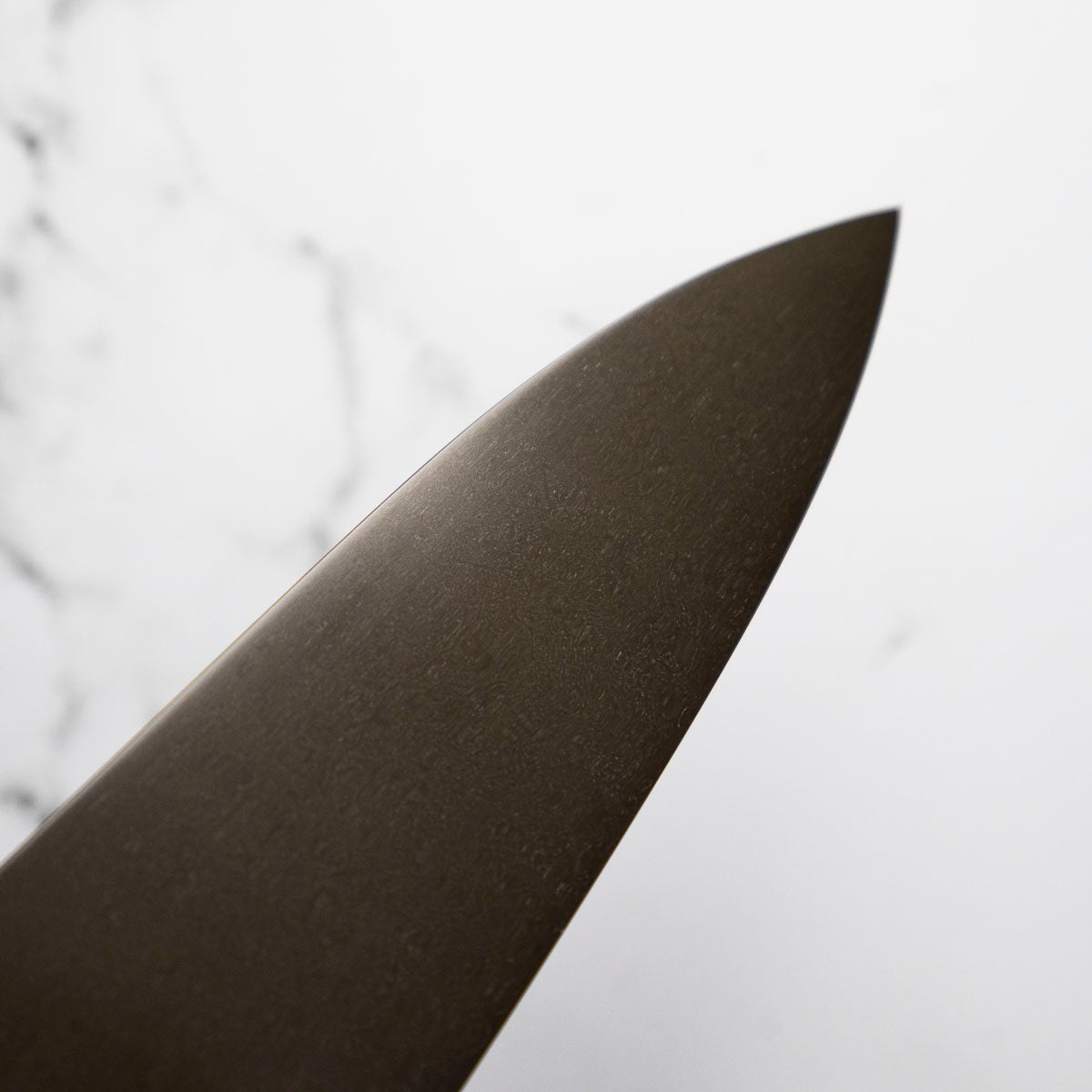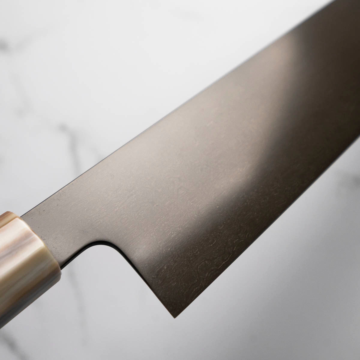 This knife is made from a high-carbon steel and as such, will require a little more care than a regular off-the-shelf knife. It must be dried shortly after use, as prolonged exposure to moisture can cause rust spots to appear. A very light coat of oil during storage also helps to prevent rust spots. A patina (colouration and seasoning of the steel) will occur with use.