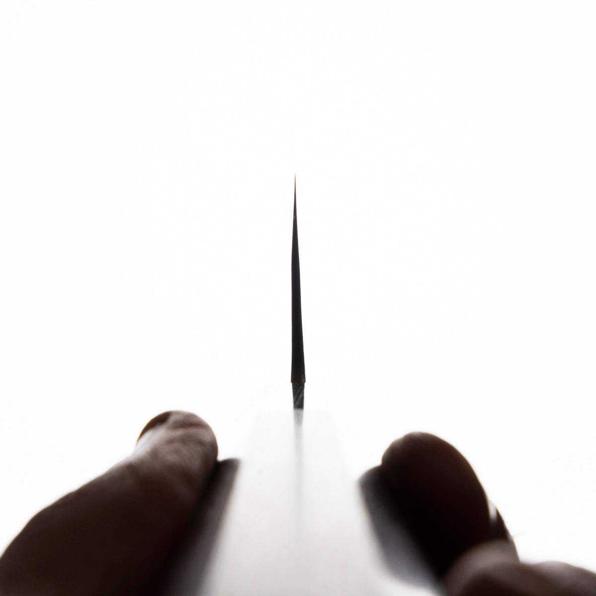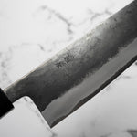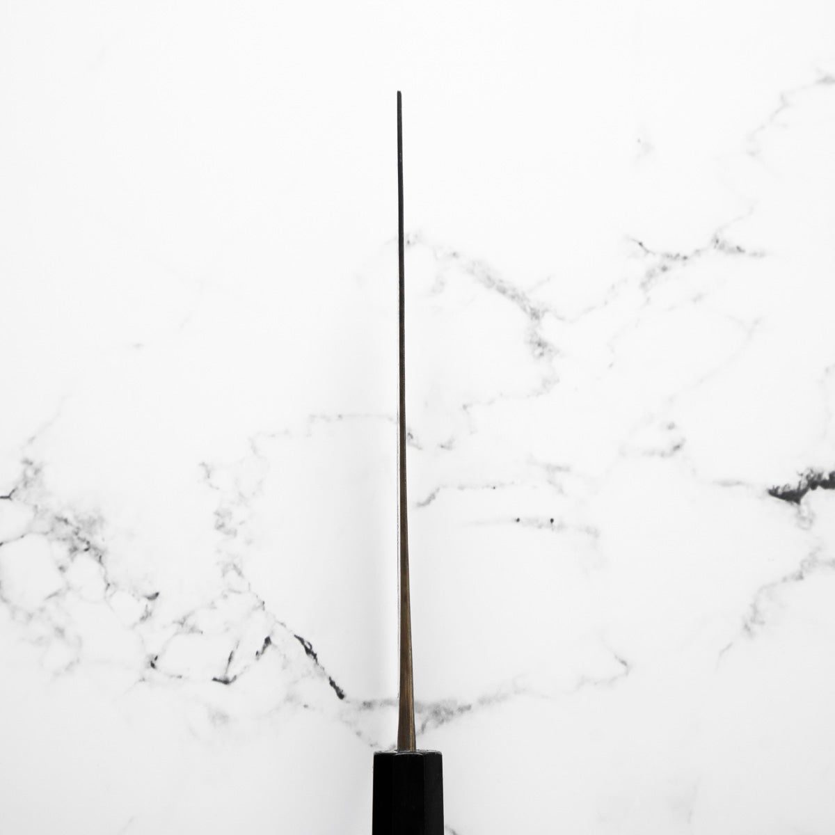Japanese White Steel #2, a traditional high-carbon steel, is cherished for its purity and fine grain structure, enabling razor-sharp edges, at the cost of being reactive. It is one of the easiest steels to sharpen, but cannot be left wet for even short periods otherwise rust spots can occur. If you’re fastidious in your knife maintenance, this knife steel can be extremely rewarding to use.